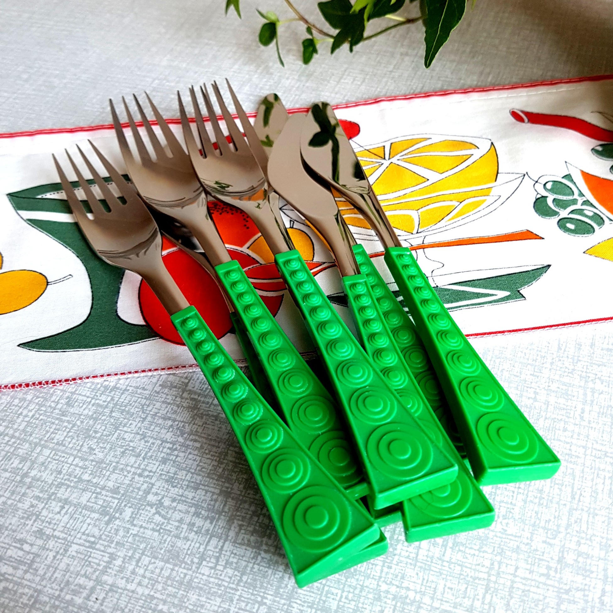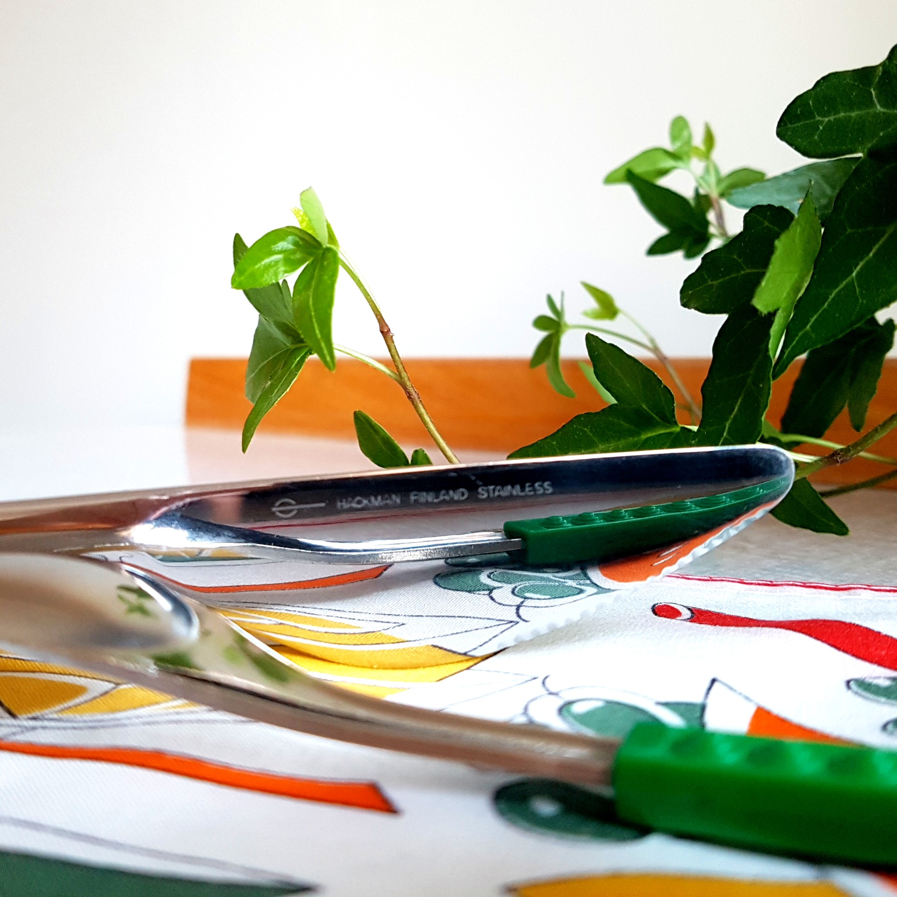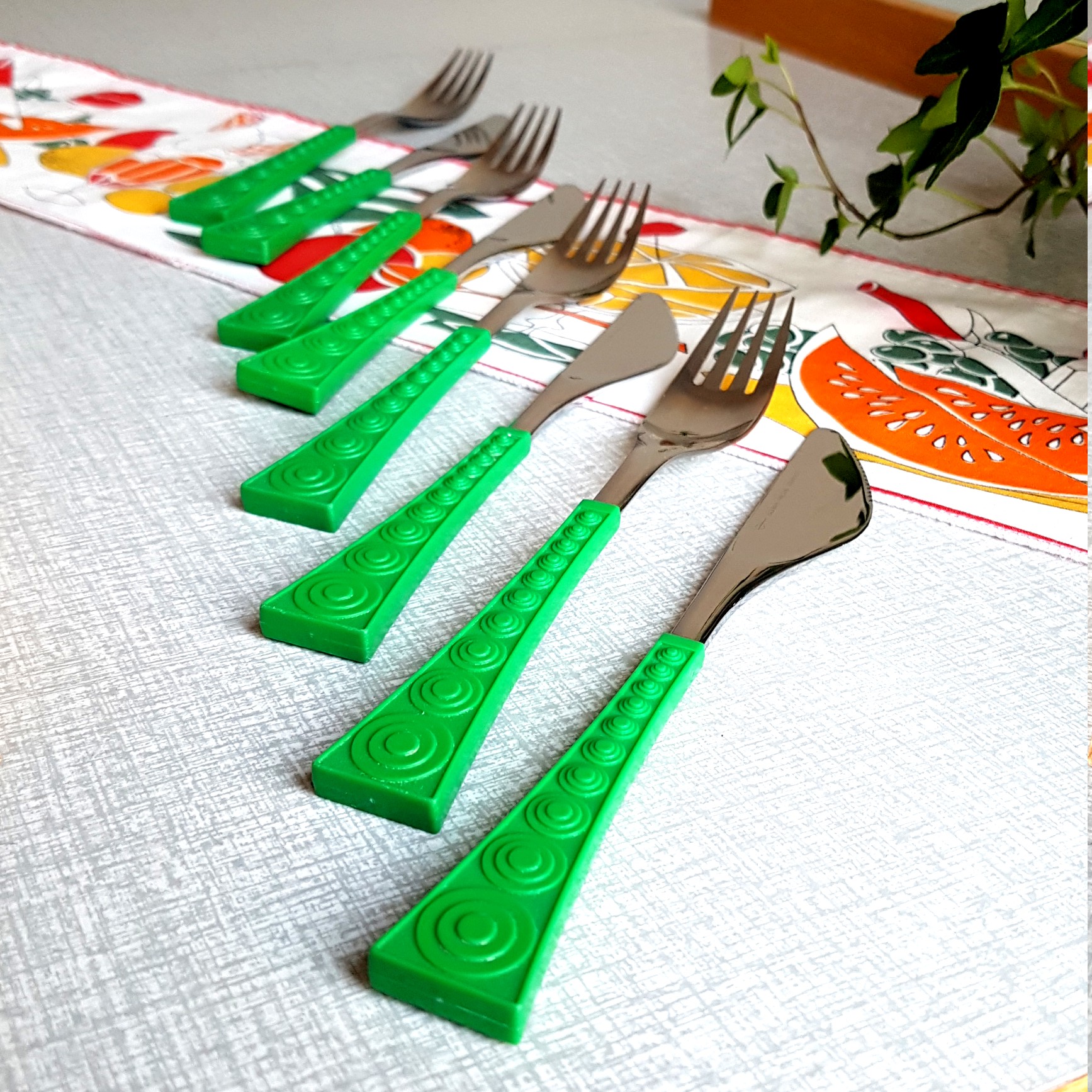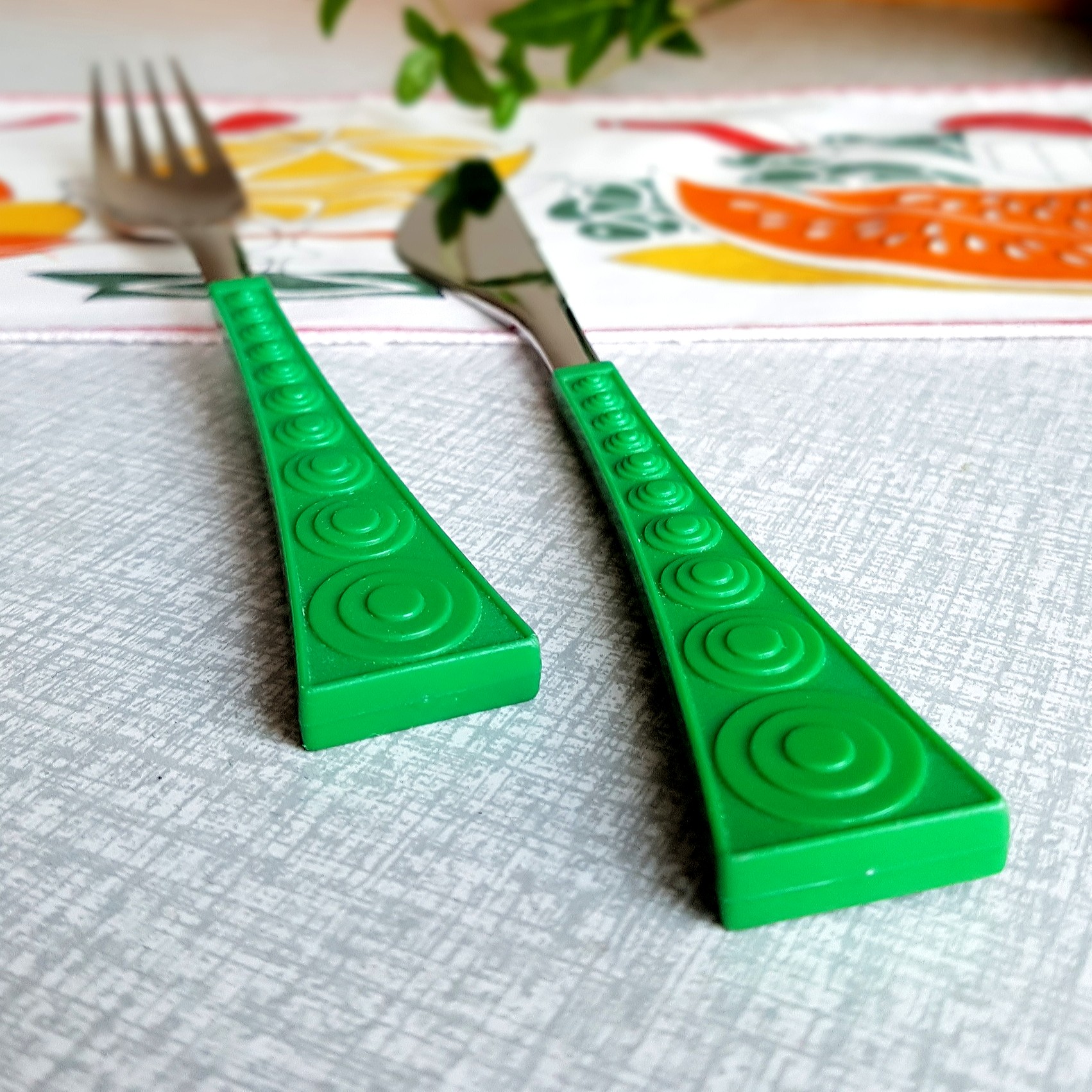 Underbara bestick ~ Colorina ~ med skaft i grönt, formgivna av Nanny Still för Hackman, Finland.