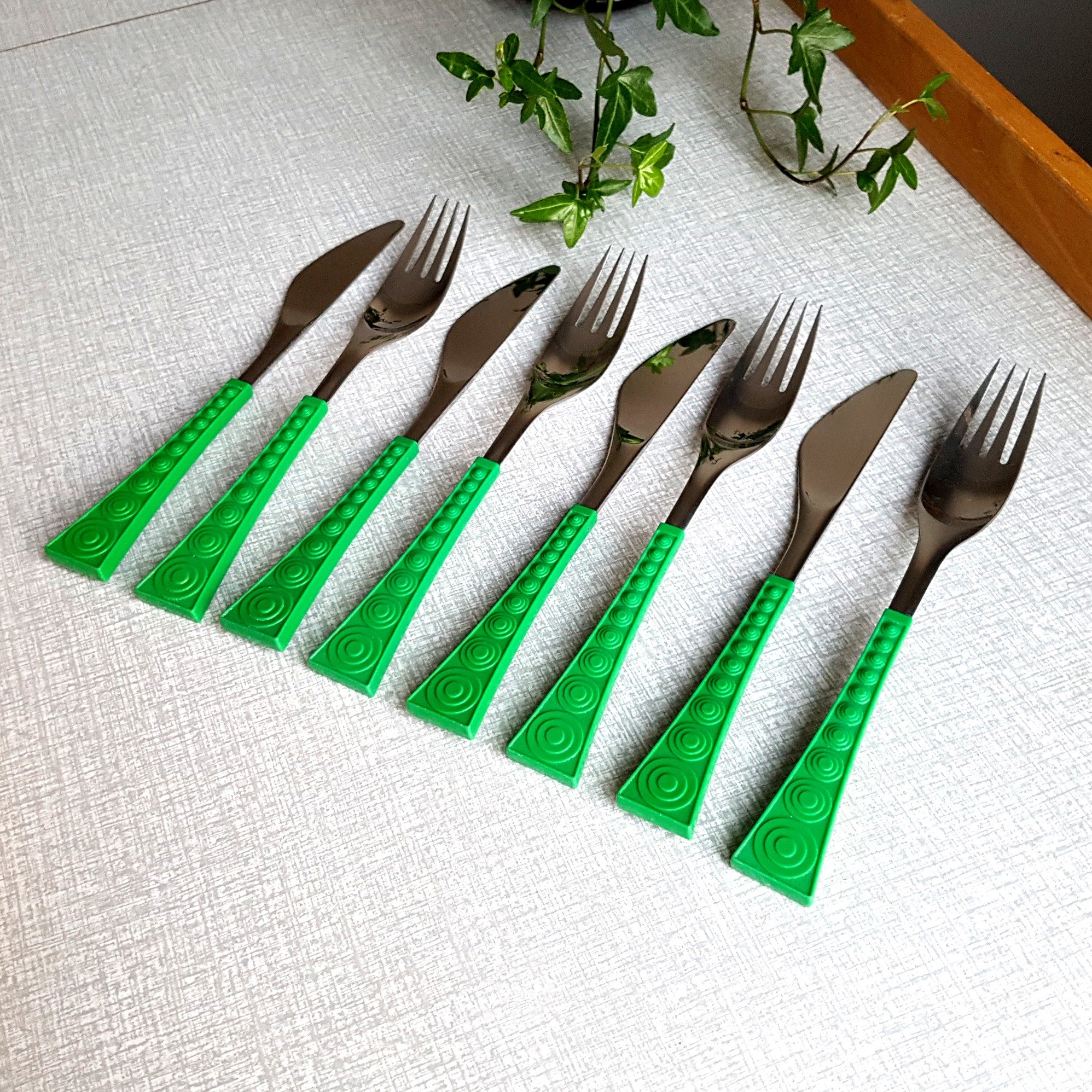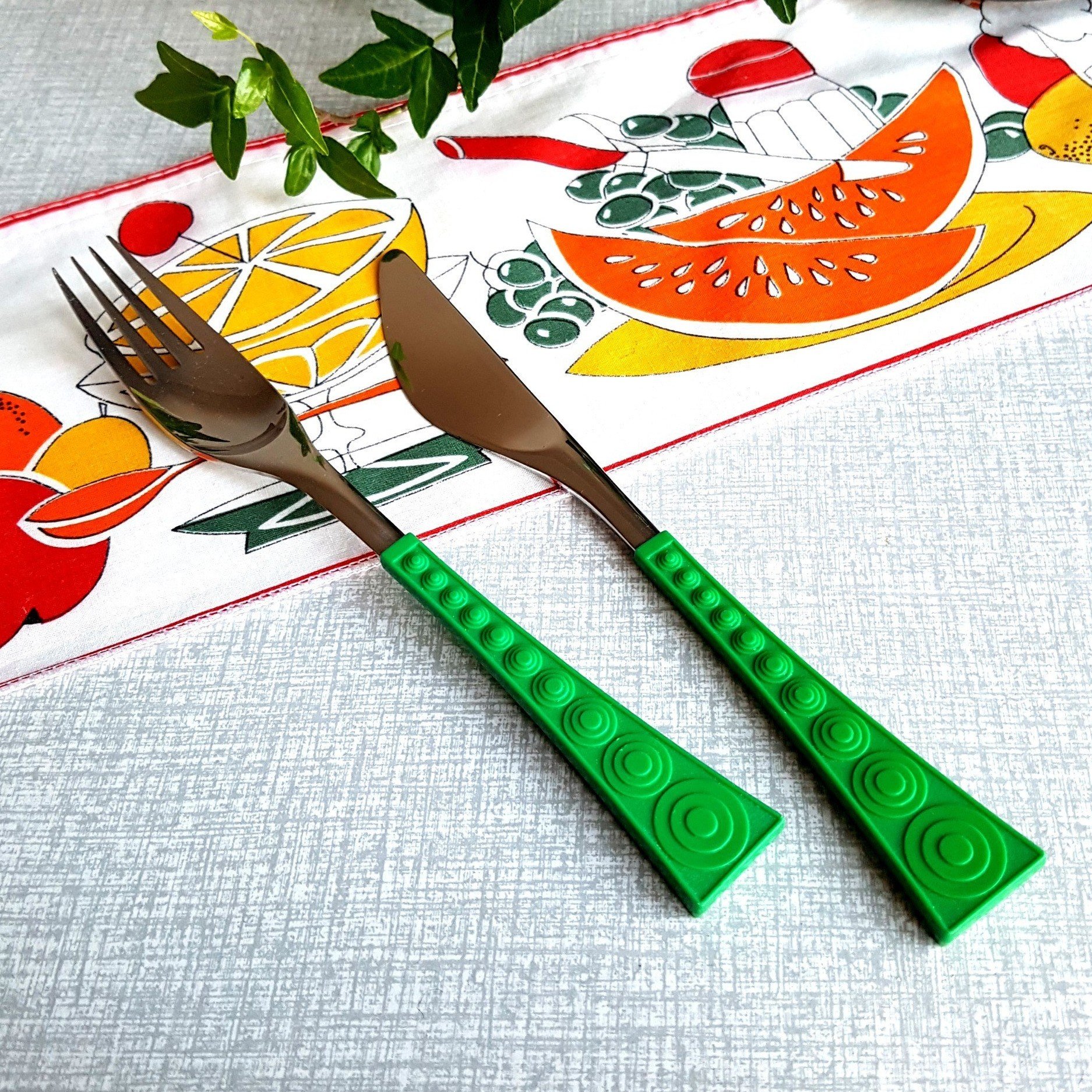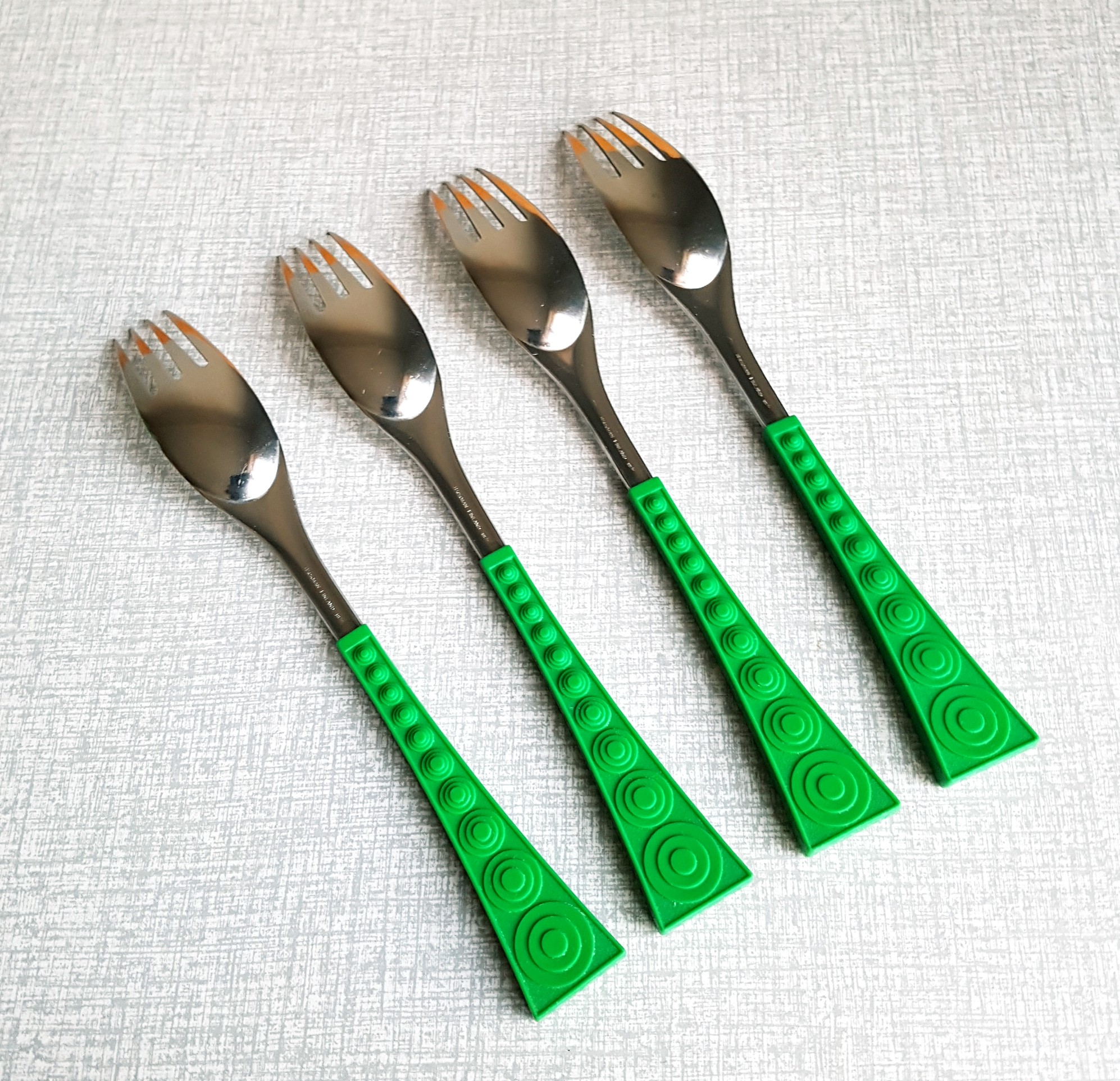 Underbara bestick ~ Colorina ~ med skaft i grönt, formgivna av Nanny Still för Hackman, Finland.