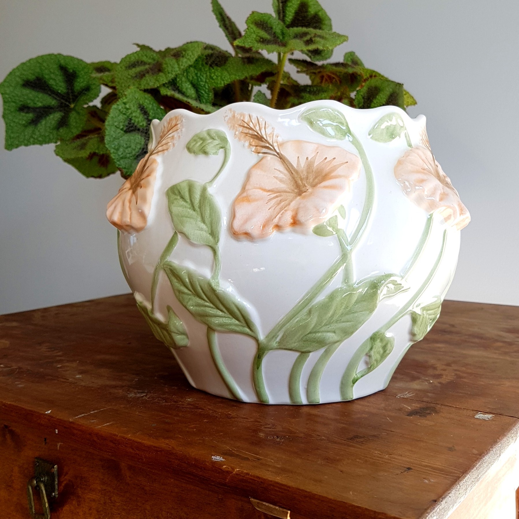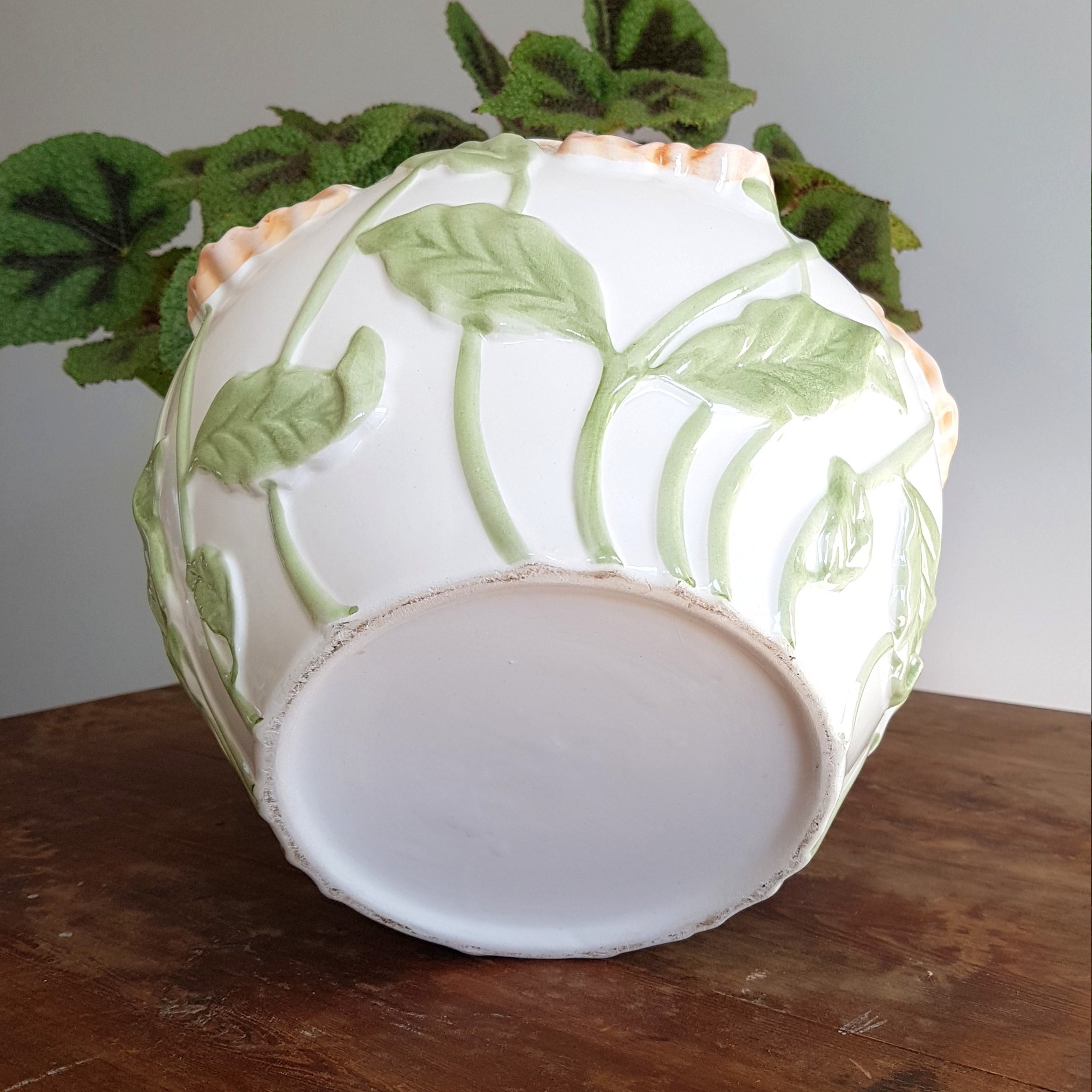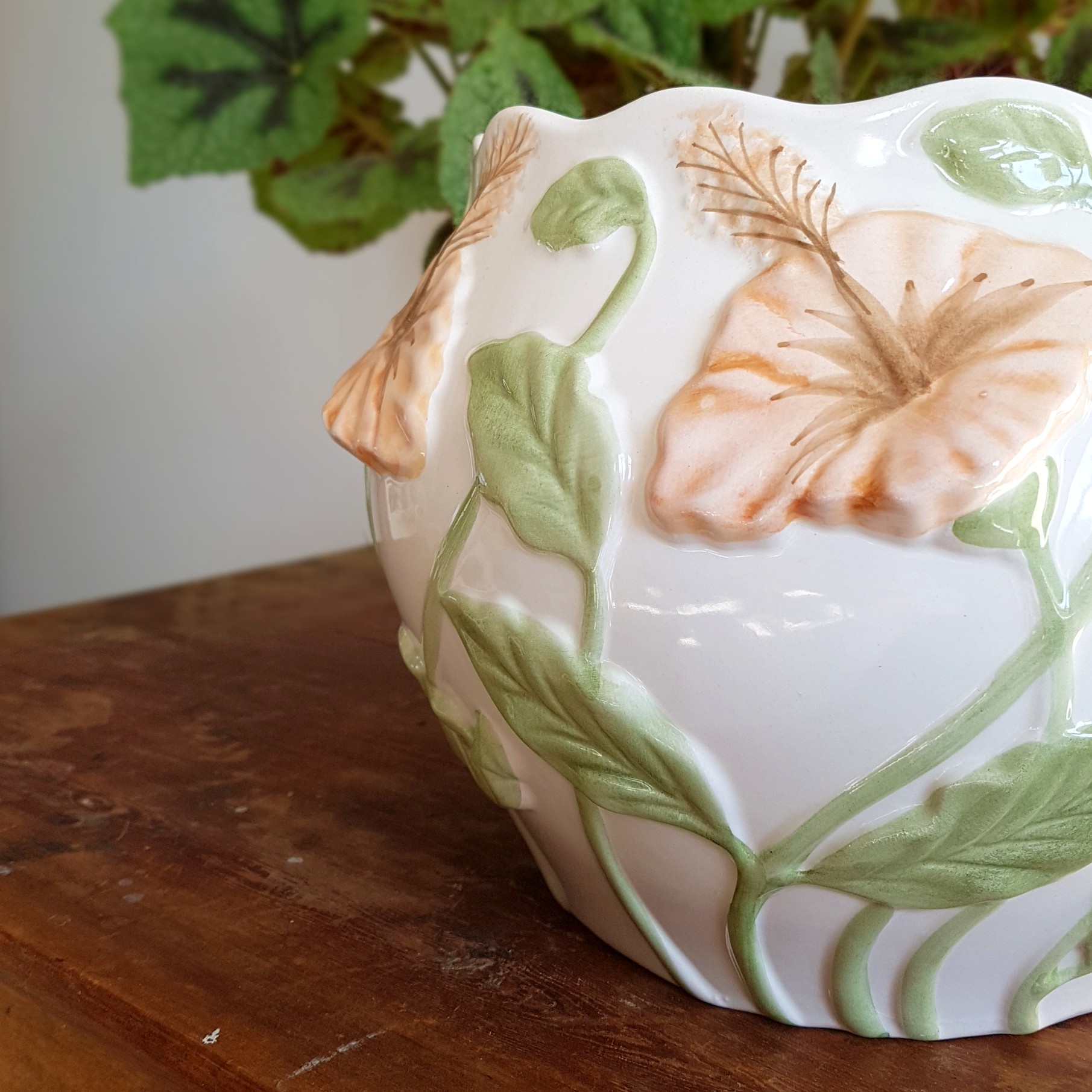 Vacker äldre ytterkruka med vågig kant i majolika, utförd i barbotine-teknik där blommor och blad byggts upp i relief och sedan glaserats i mjuka, harmoniska färger.