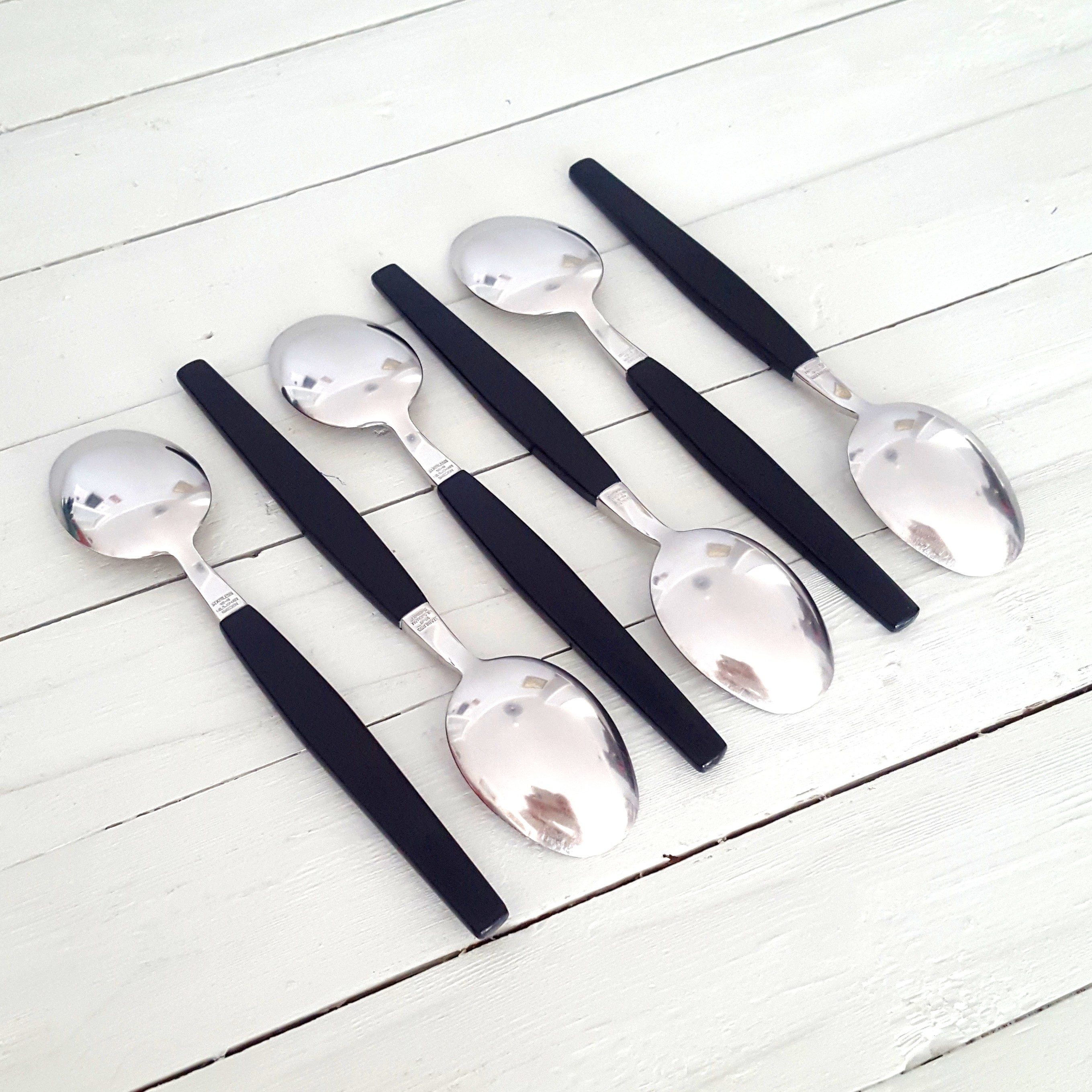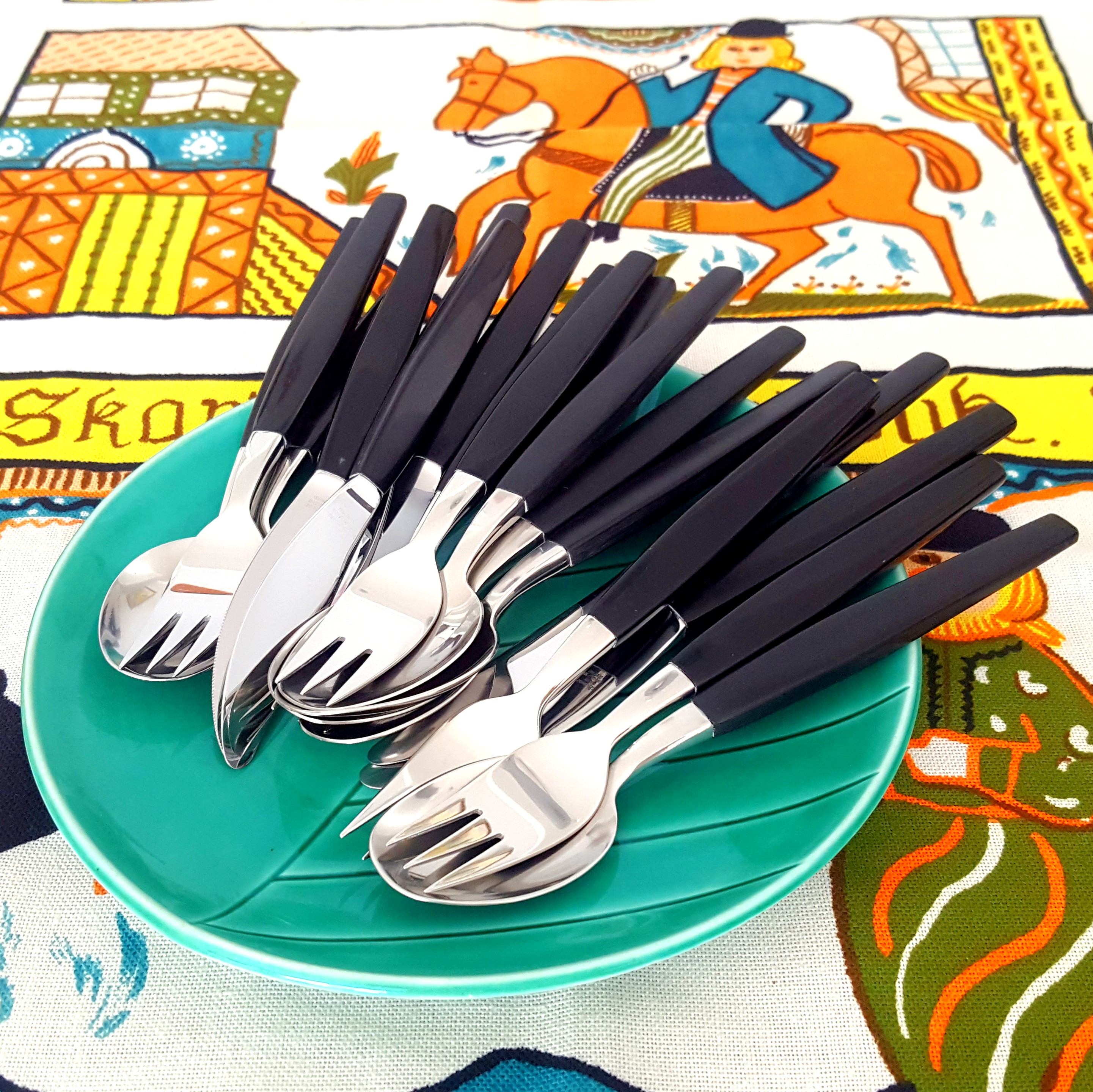 Fina dessertbestick – Singoalla  med svart nylonskaft & rostfritt stål från Nilsjohan – 50-talet.