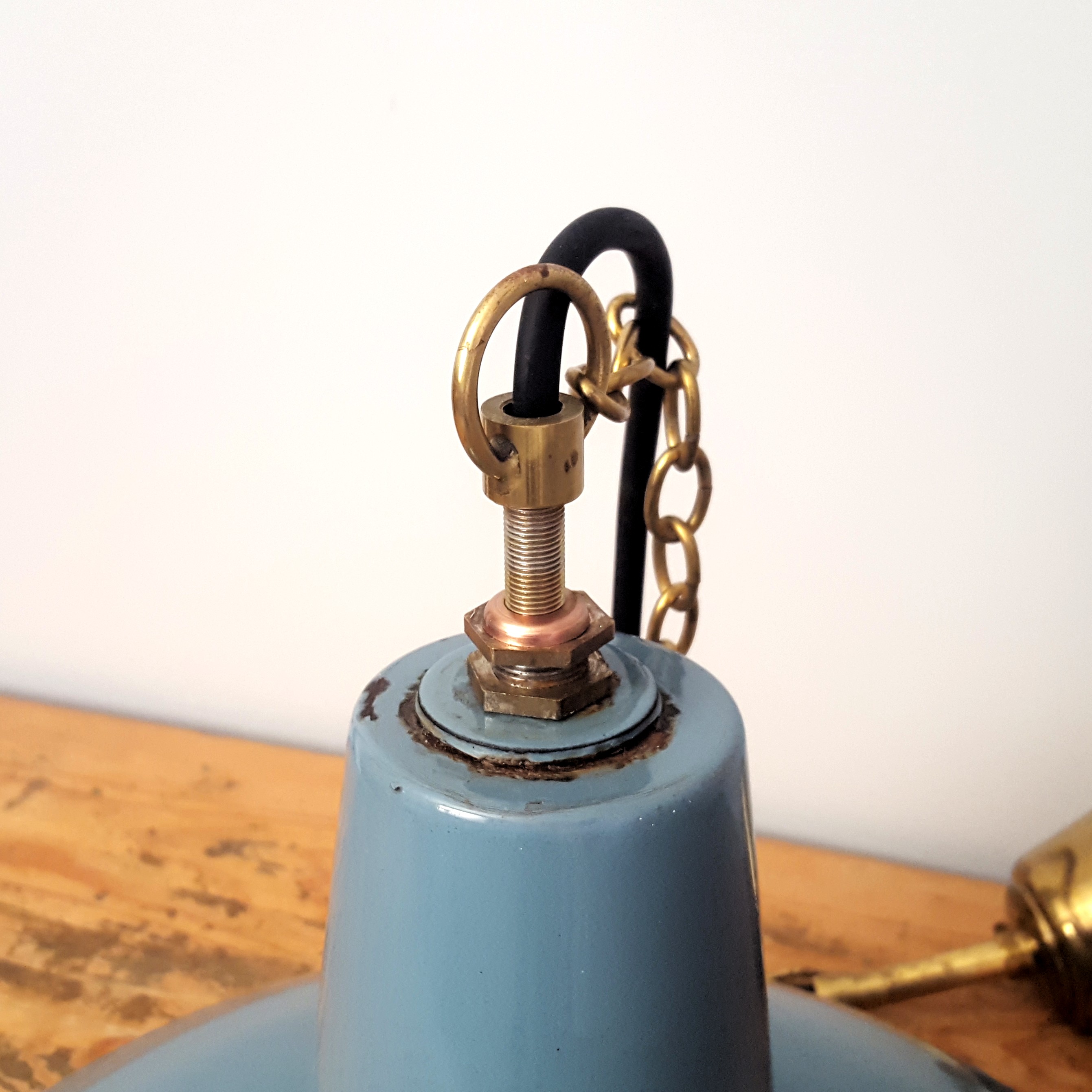 Emaljerad gråblå utsida och vit insida – kedjan och takkopp i mässing.