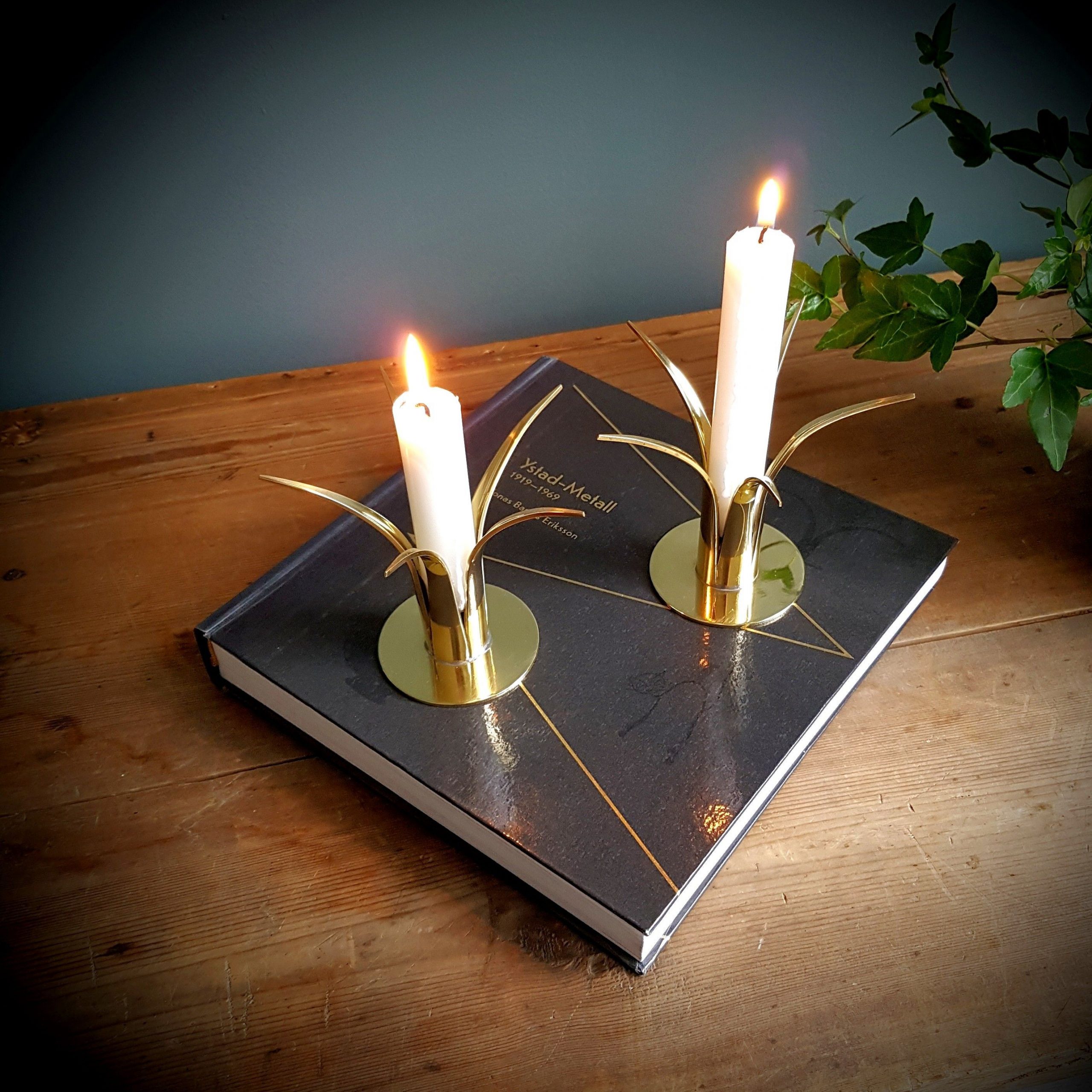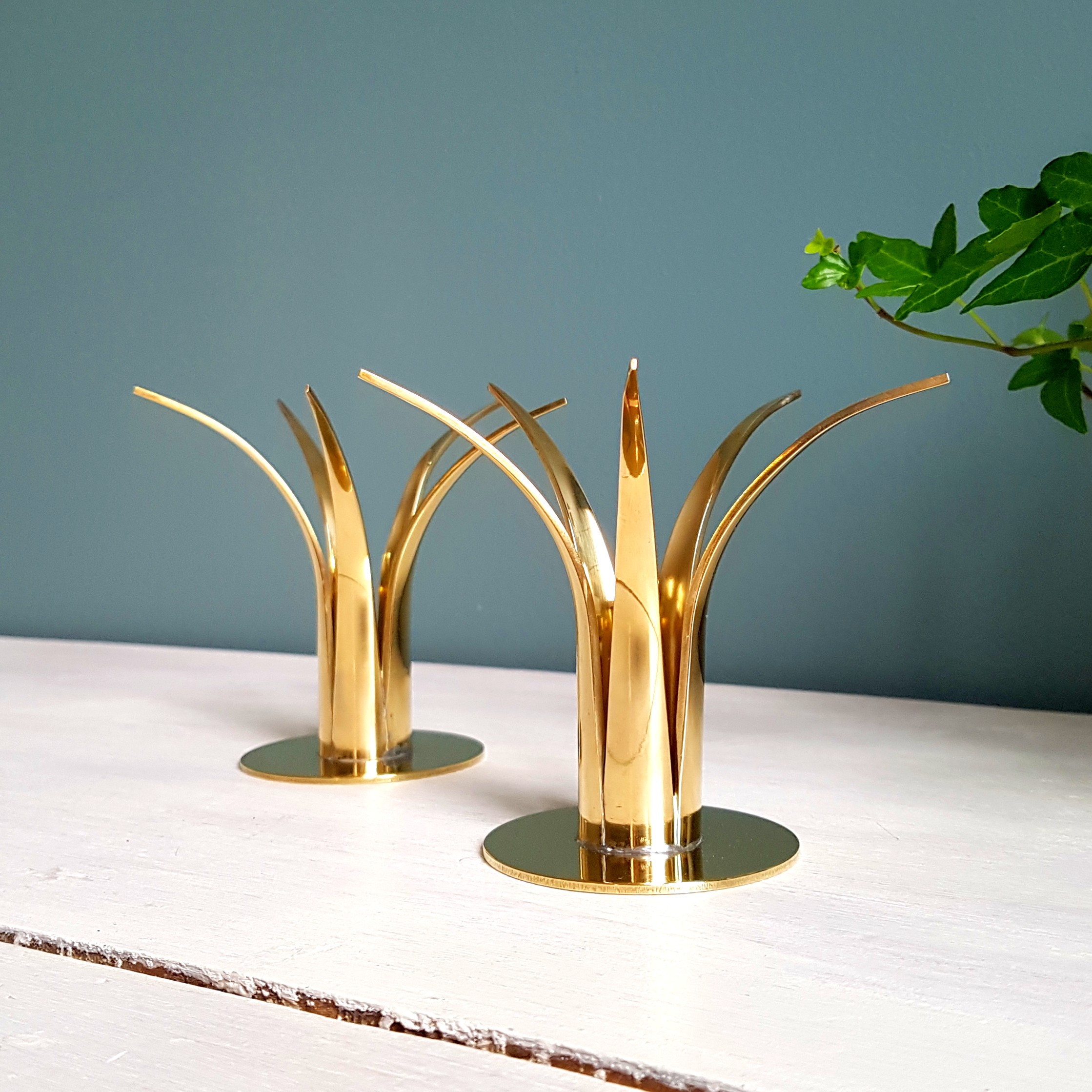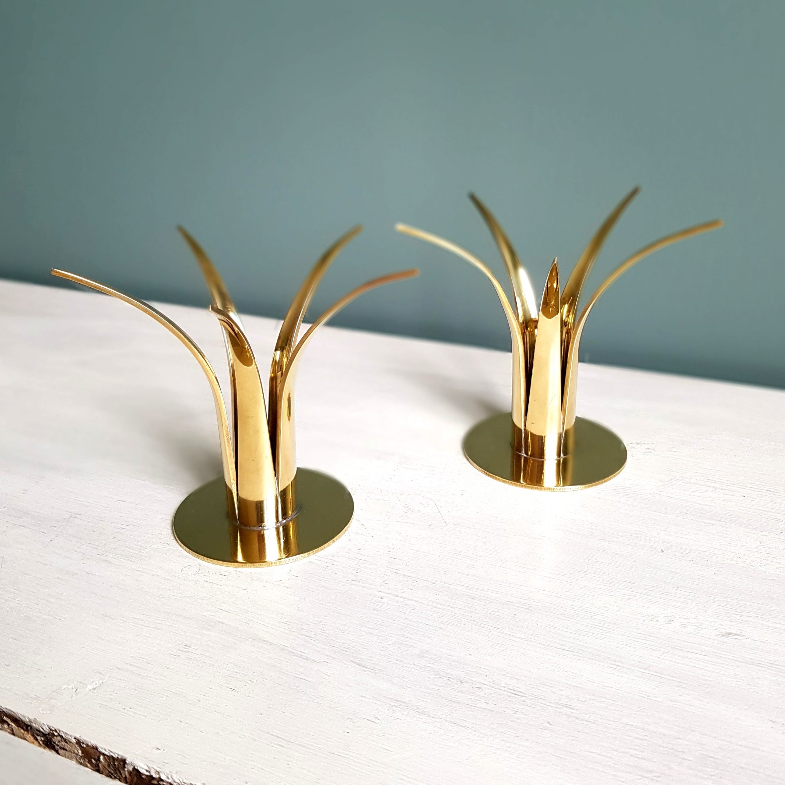 Ett par äldre ljusstakar i blankpolerad mässing, möjligen modellen ~ Kronan ~ av Aktiebolaget Ystad Metall, Ystad.