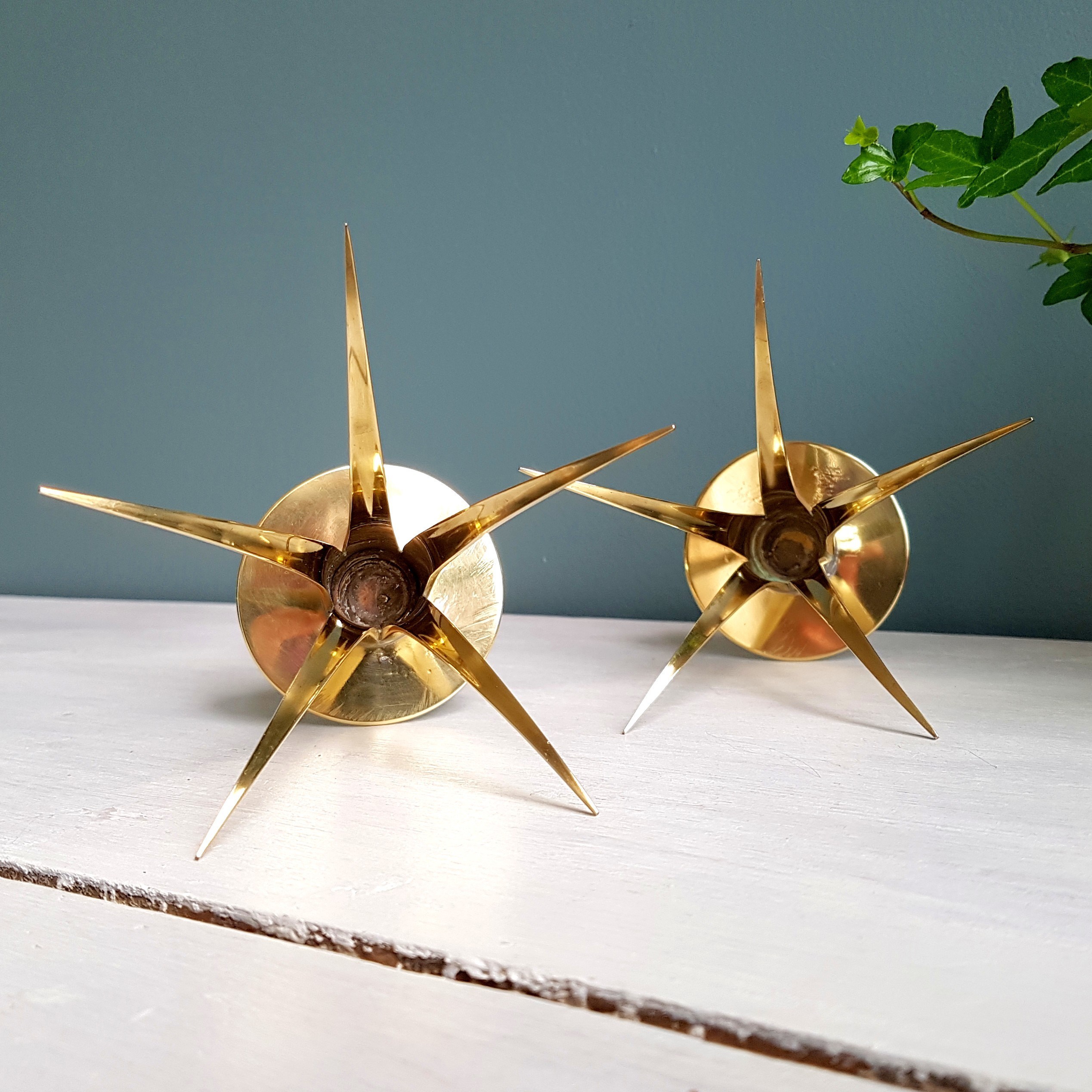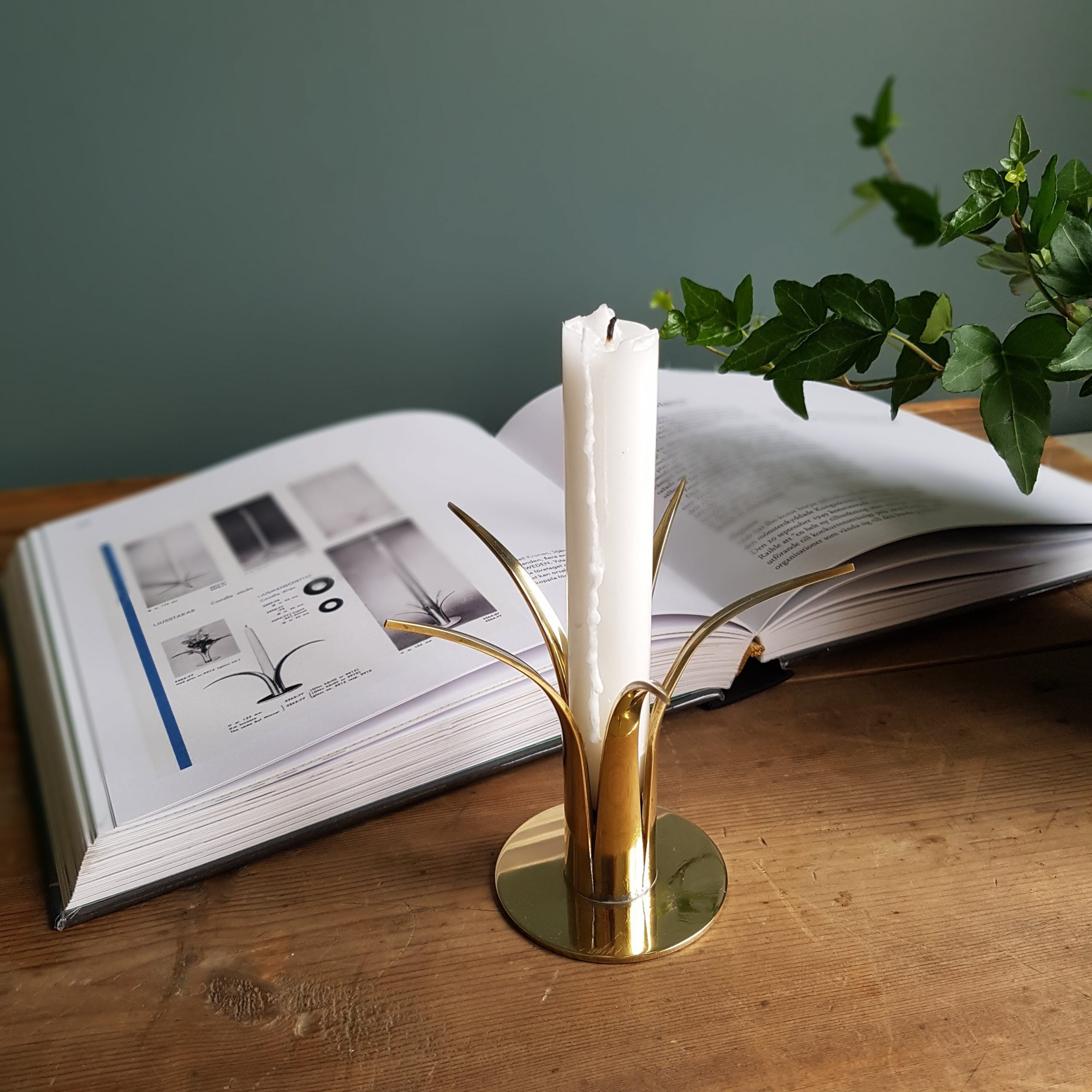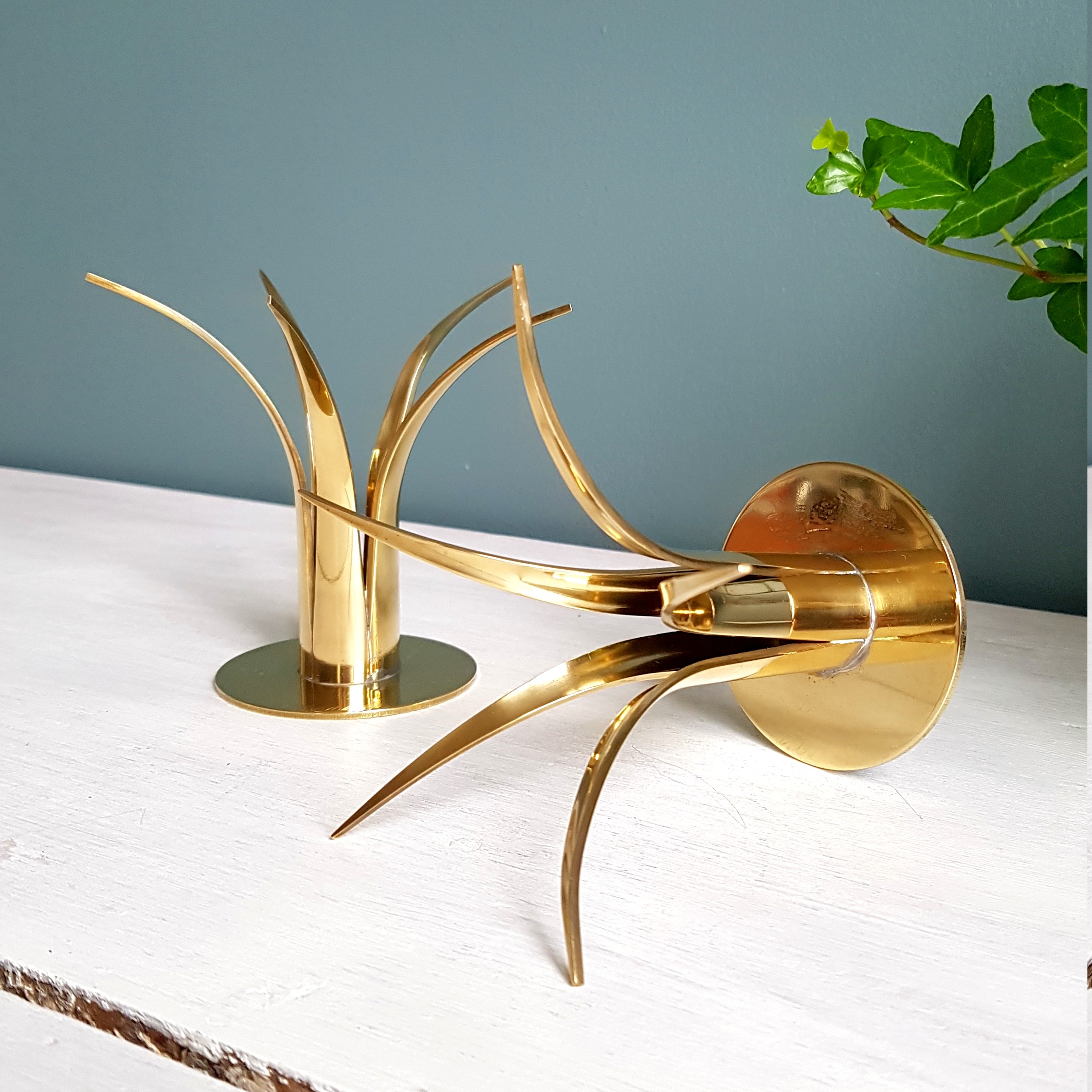 Ett par äldre ljusstakar i blankpolerad mässing, möjligen modellen ~ Kronan ~ av Aktiebolaget Ystad Metall, Ystad.
