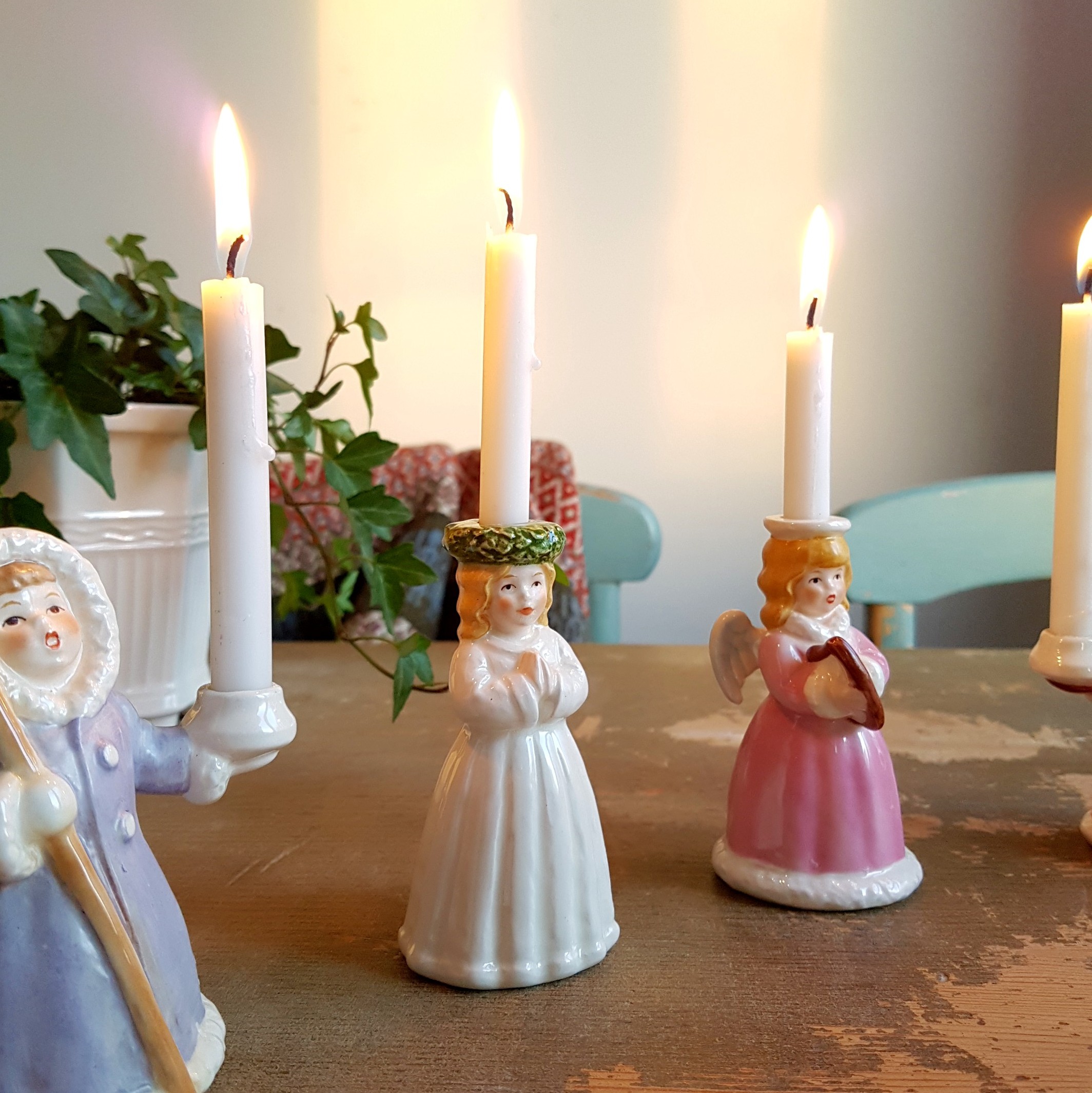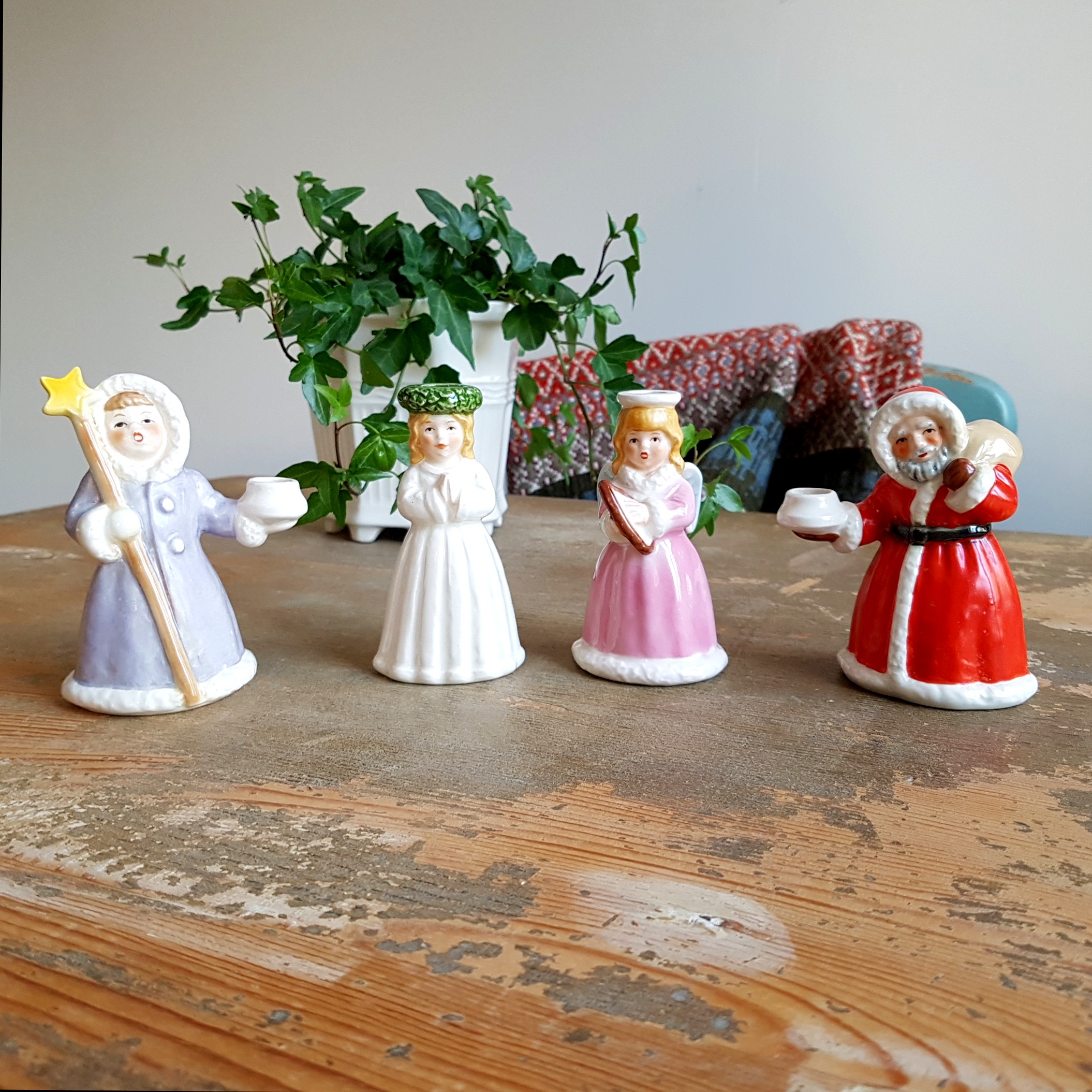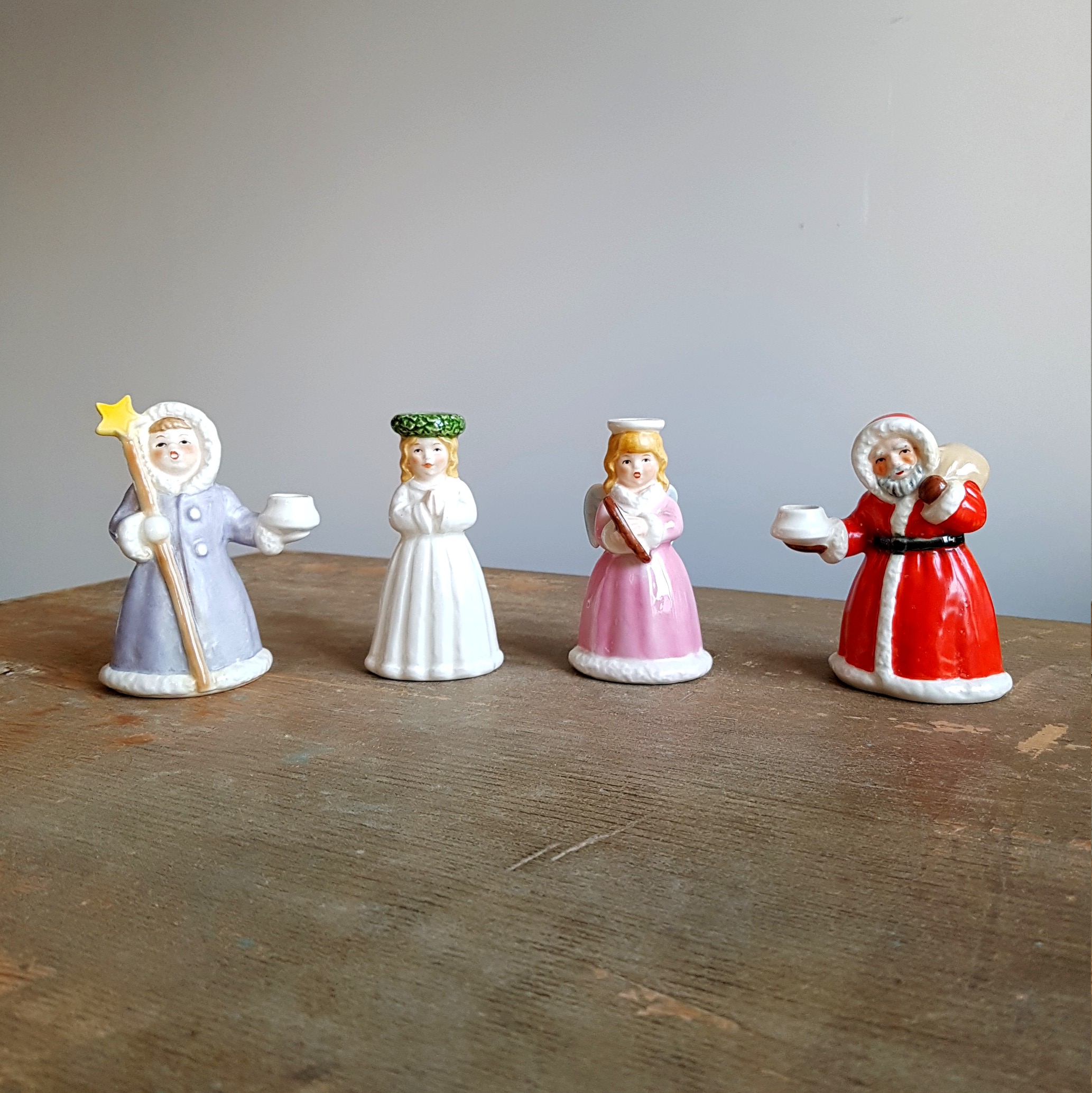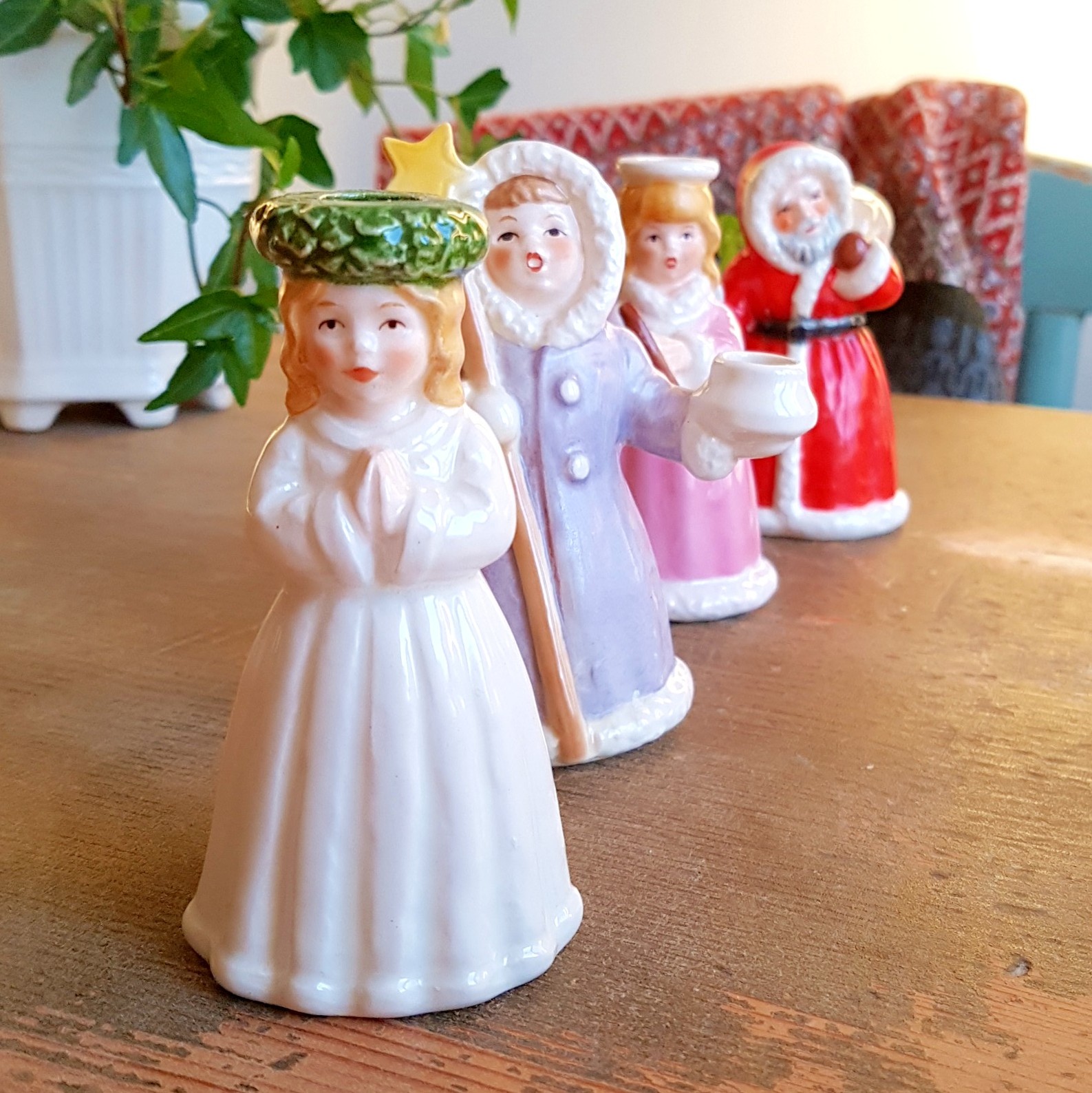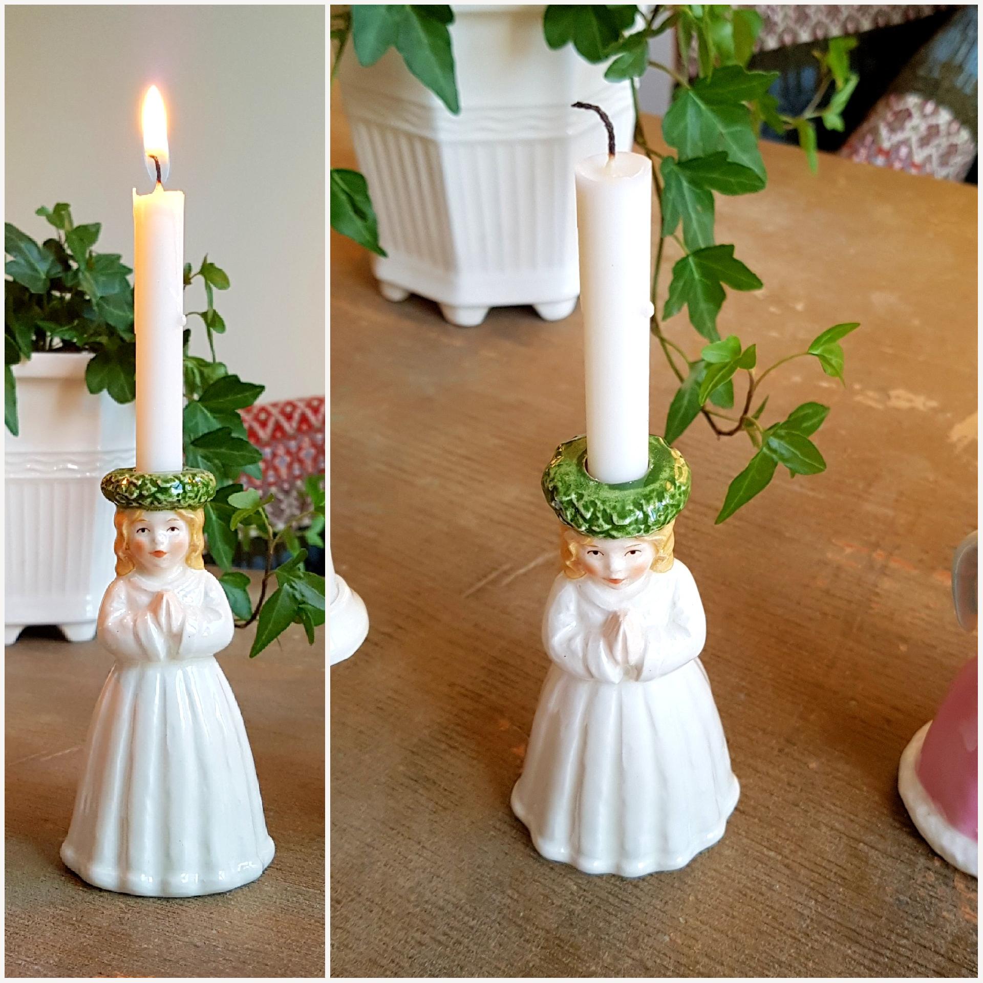 Ett charmigt och stämningsfullt retro luciatåg i porslin, tillverkat av Goebel för Fyrklövern – 70/80-talet.