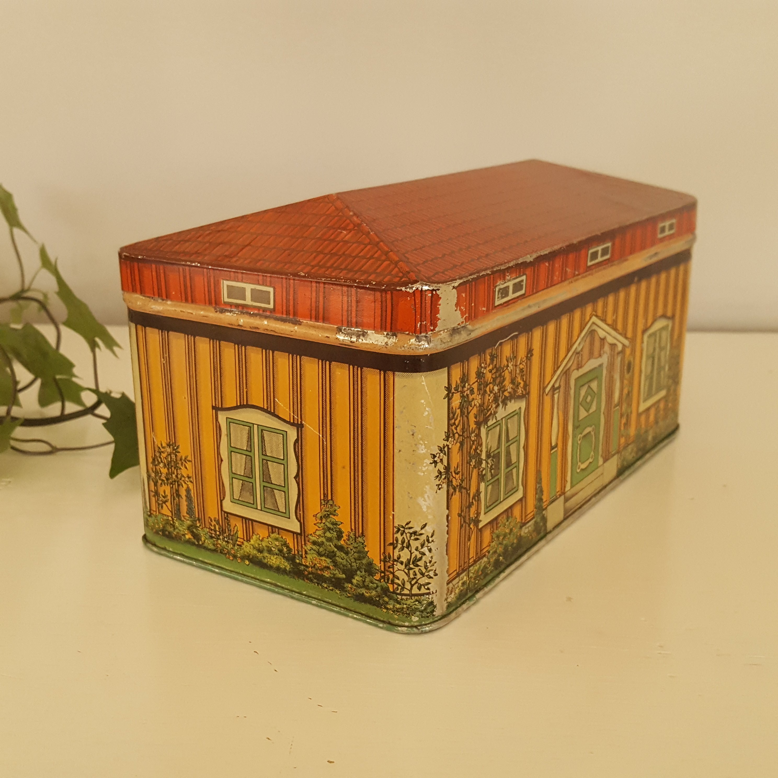 Äldre plåtburk med härlig patina i form av ett hus i litograferad plåt från Gevalia-rosteriet Gefle.