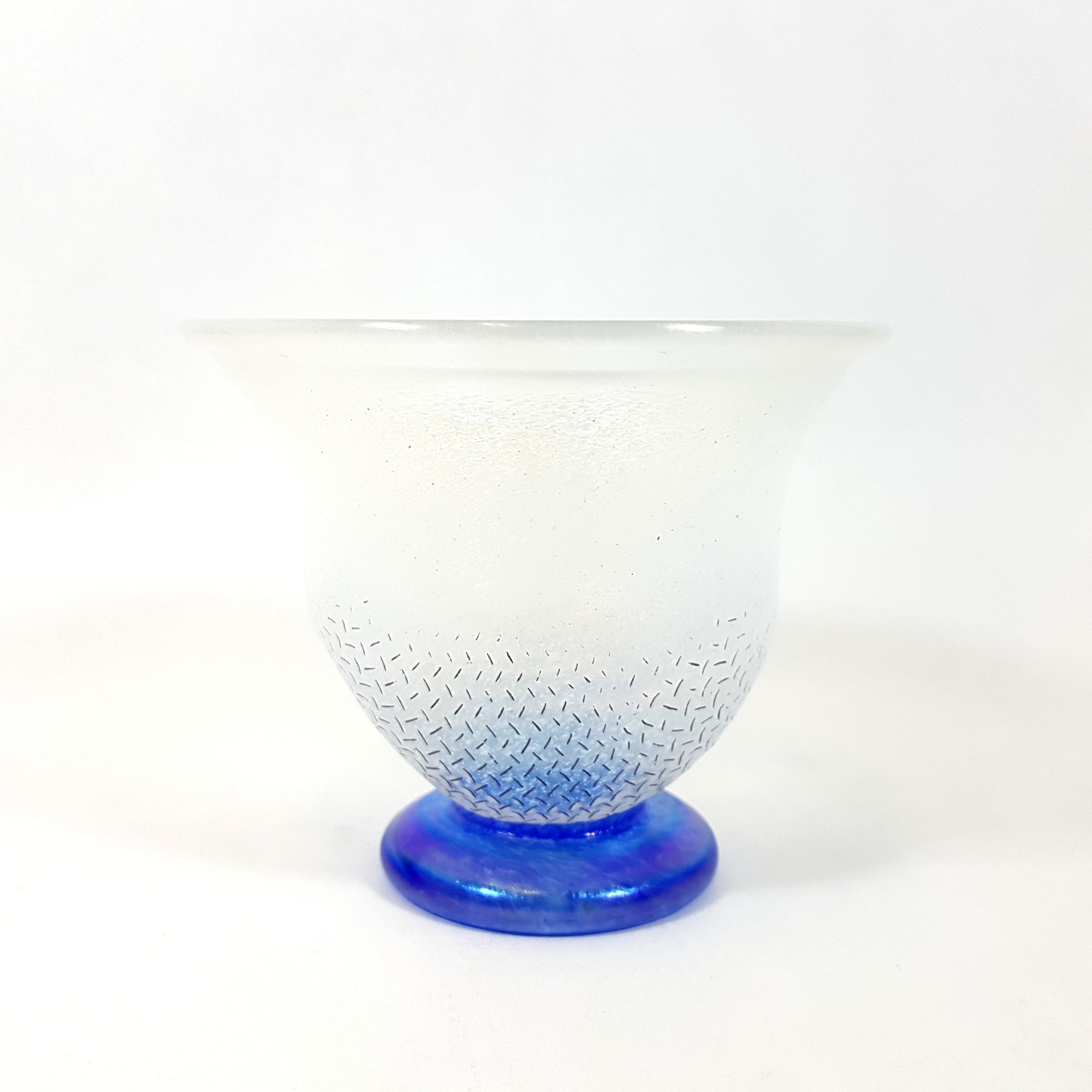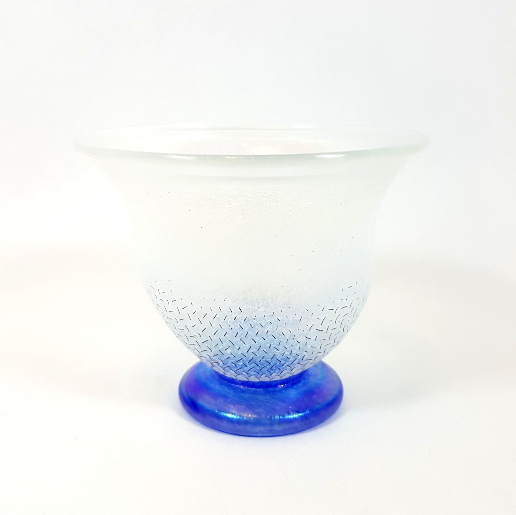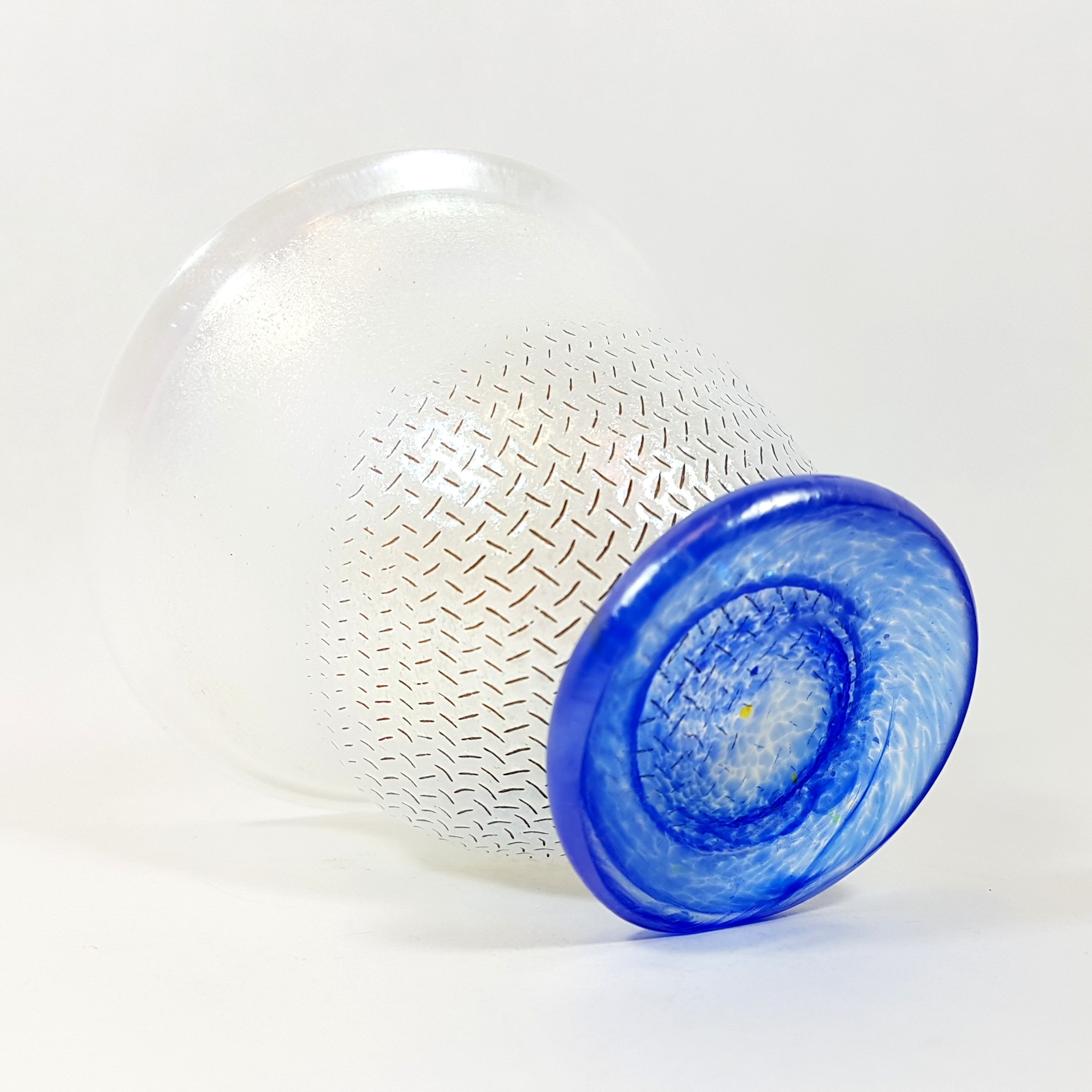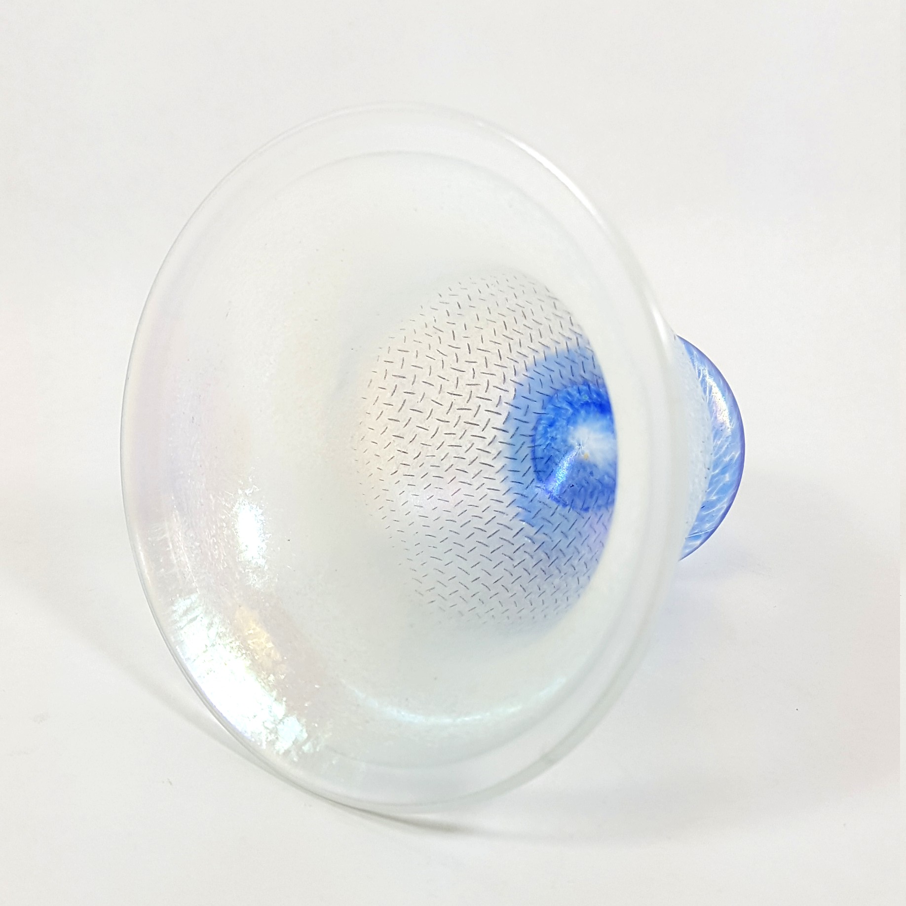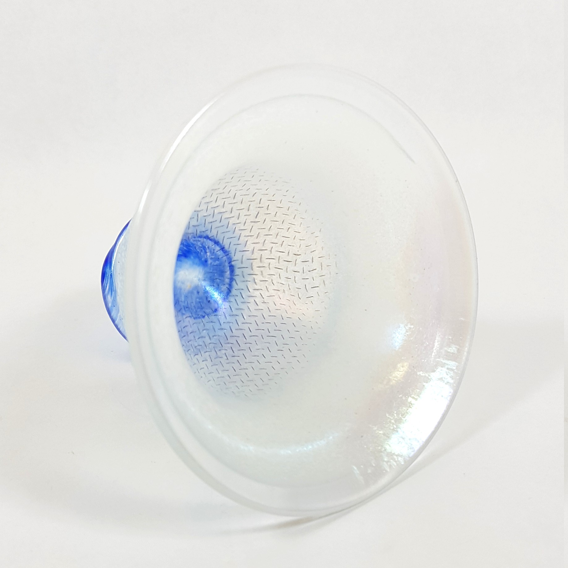 Det frostade, svagt iriserande glaset har ett distinkt nätmönster, skapat genom att det smälta glaset blåsts mot en metallskärm.