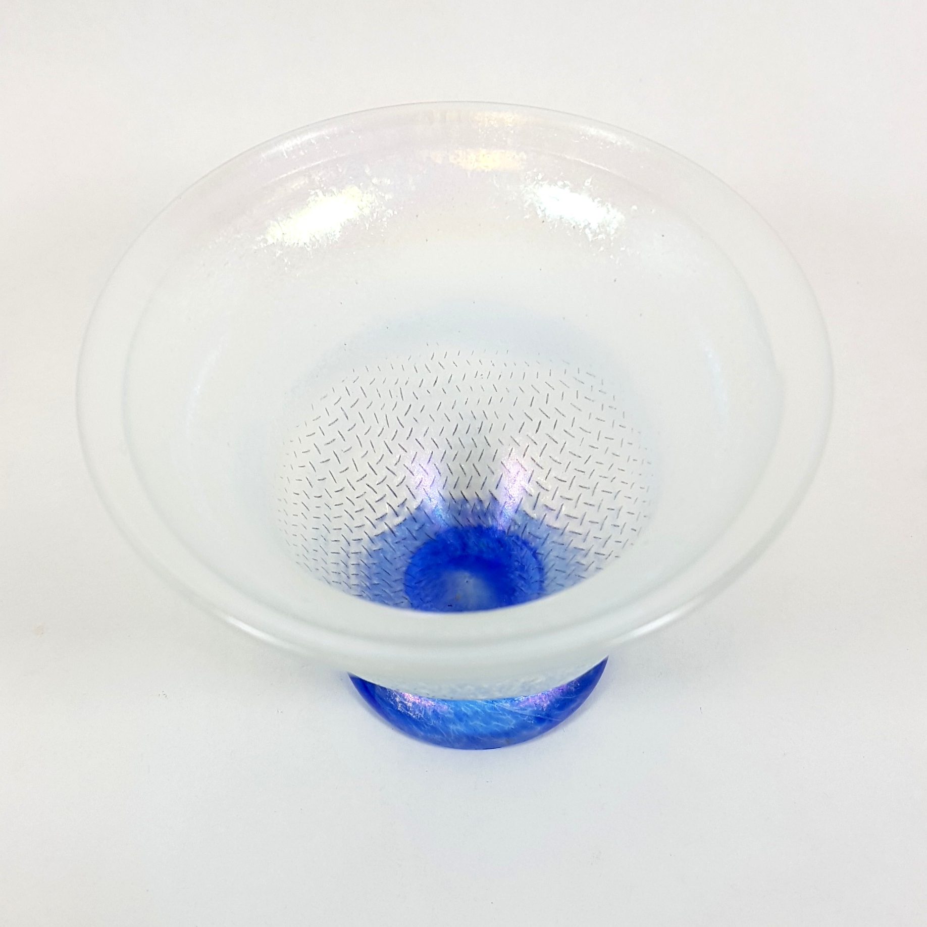 Skålen har en mystisk karaktär med en blålila nyans i foten och en matt yta som skimrar av pärlemorsliknande effekter.