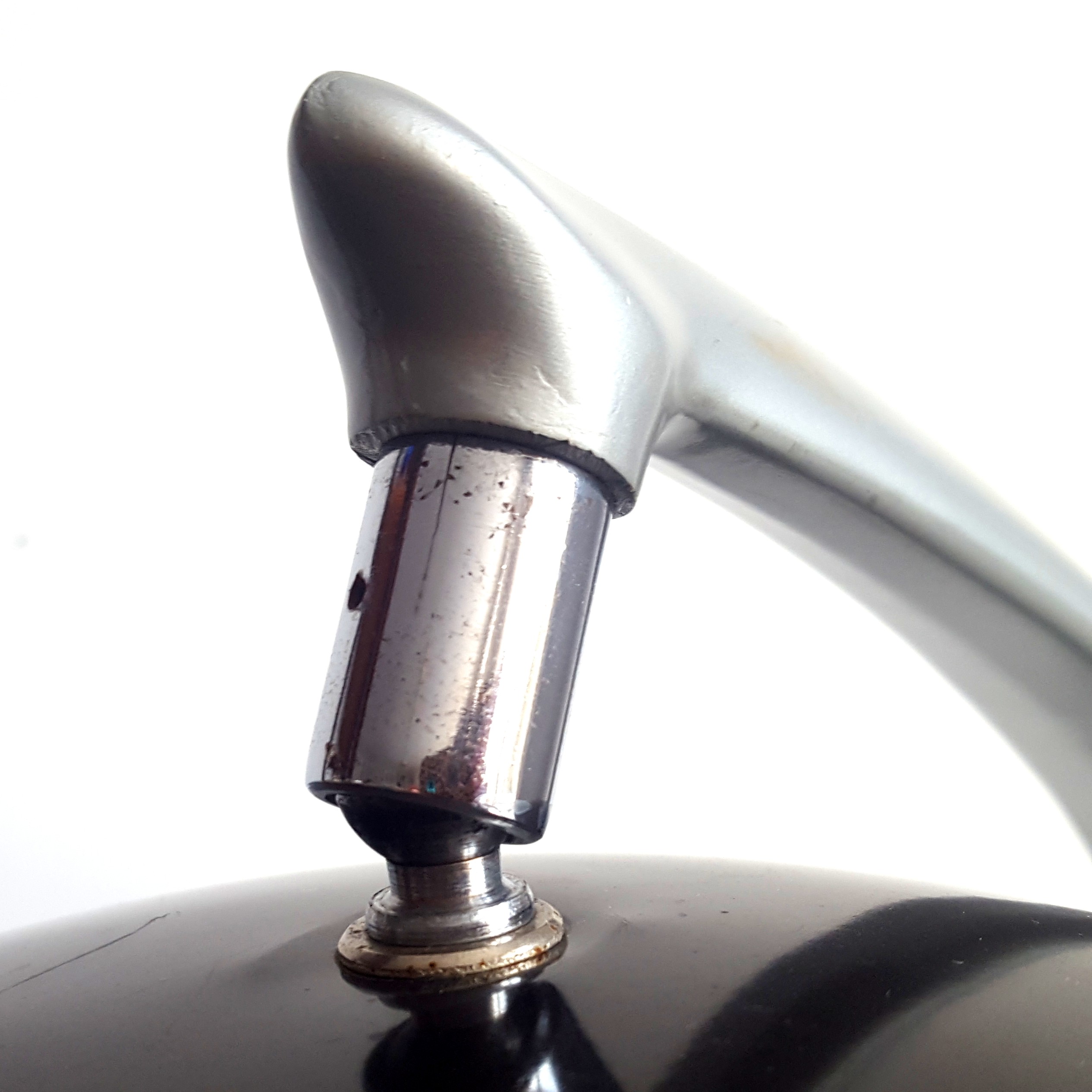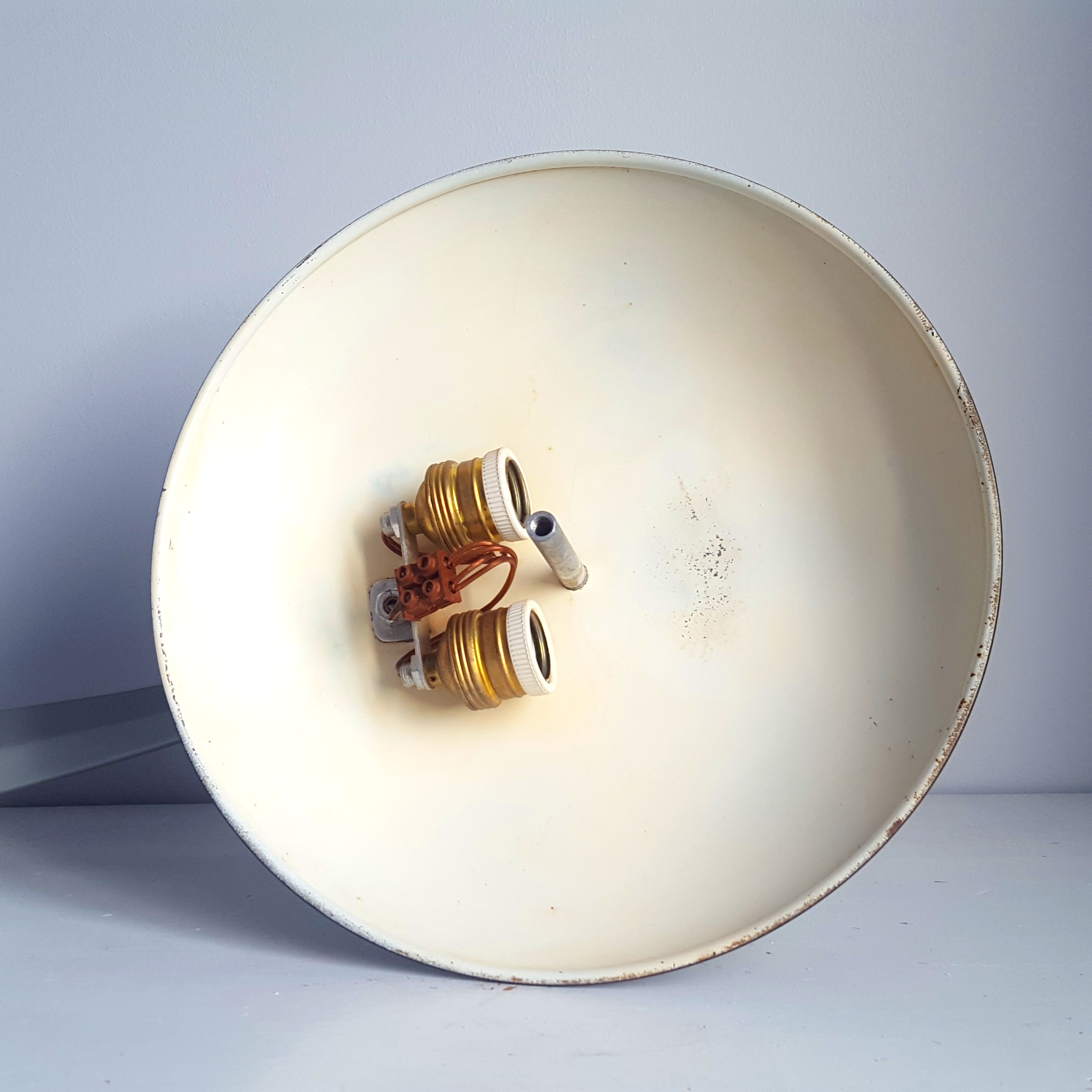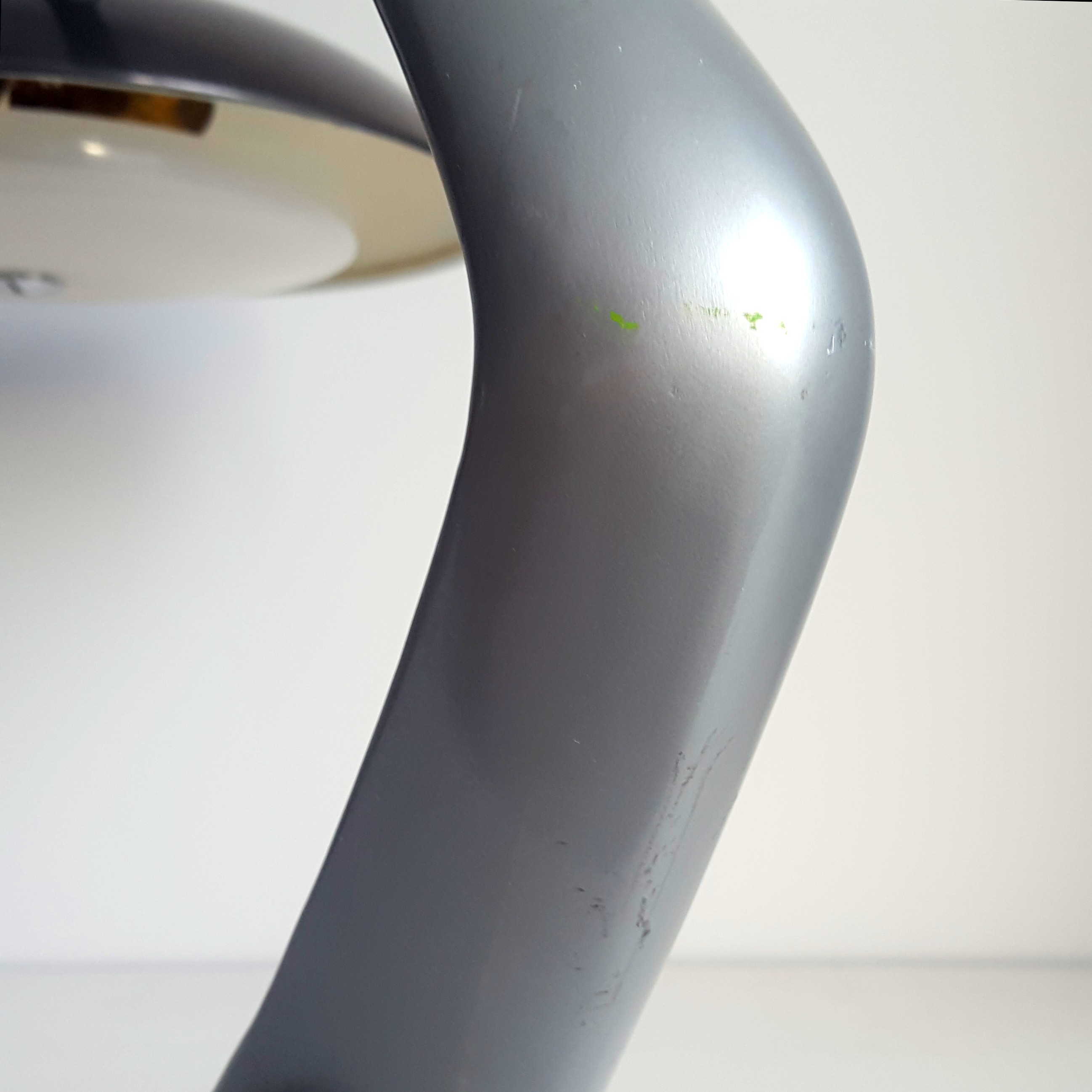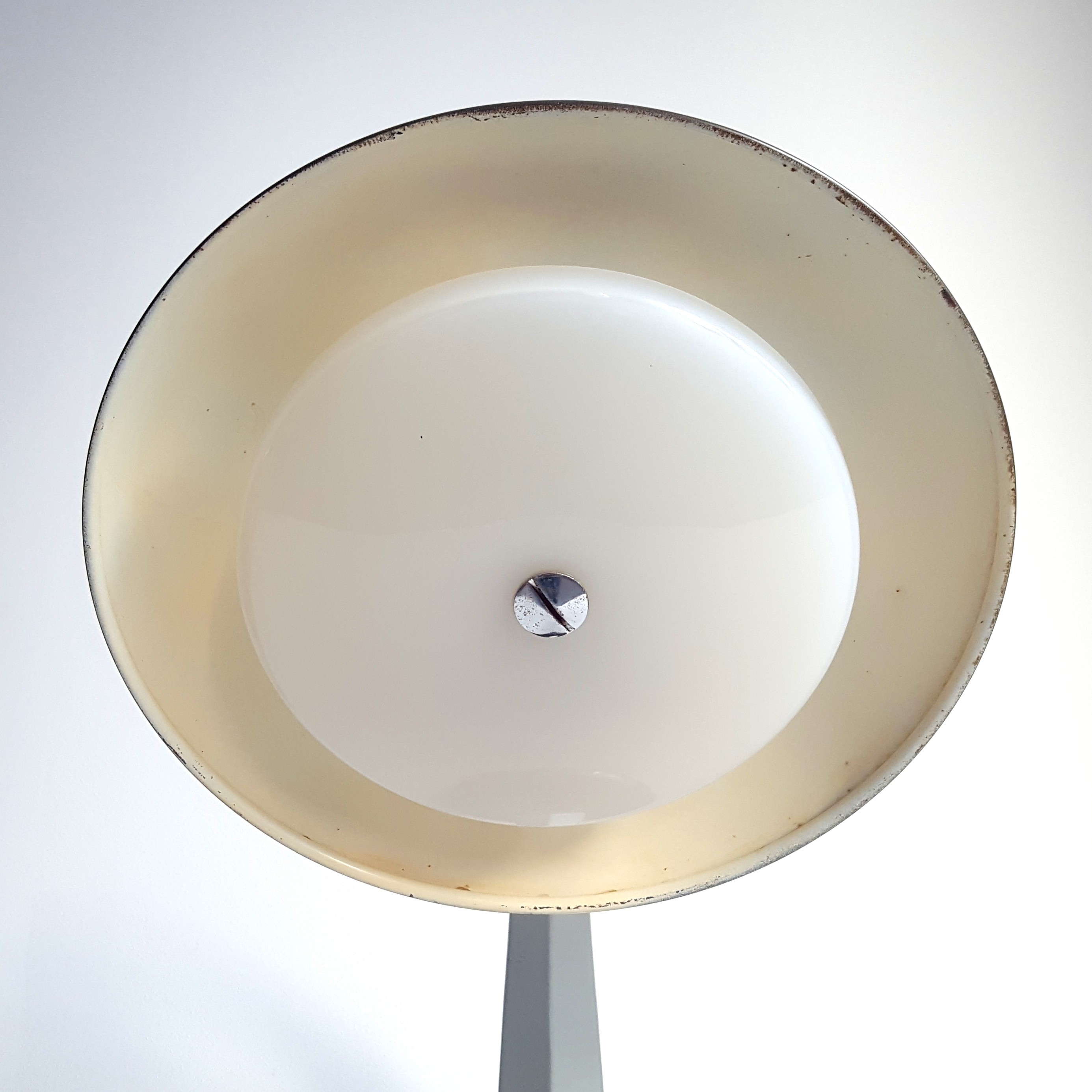 Material: anodiserat aluminium, grå lackerad plåt skärm med akryl diffusor, gjutjärnsfot och krom detaljer.