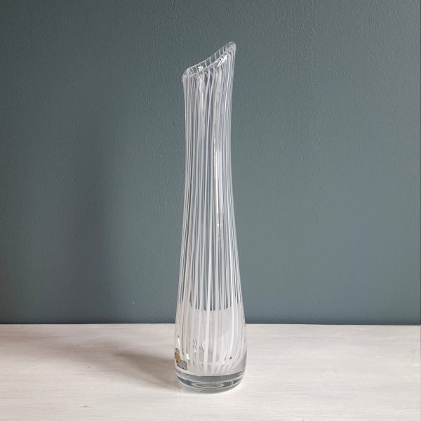 Elegant vas i klarglas med rena, vita linjer i underfånget från Skrufs Glasbruk – 50-/60-talet.